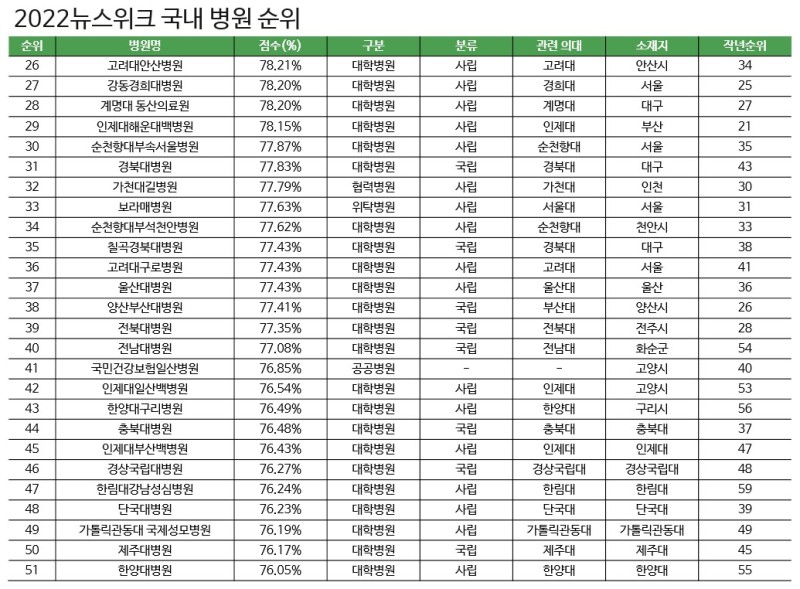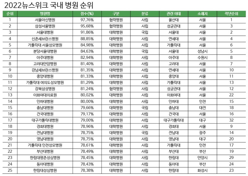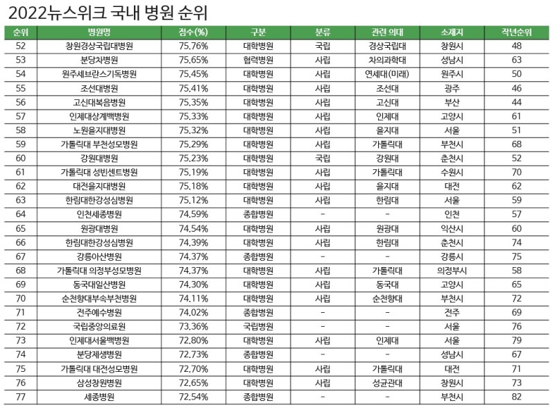 [스크랩] 2022년 국내 종합병원 순위 작성자KF21 보라매|작성시간23.02.06|조회수1,908 목록 댓글 15 글자크기 작게가 글자크기 크게가 빅5 : 아산 삼성 서울대 세브란스 성모+ 분당서울대 아주대 고대안암이렇게는 거의 고정인 듯 하네요. 다음검색 스크랩 원문 : 스카이 스크래퍼스 (SKYSCRAPERS) 현재 게시글 추가 기능 열기 북마크 공유하기 신고 센터로 신고 댓글 댓글 15 댓글쓰기 답글쓰기 댓글 리스트 작성자지중해 | 작성시간 23.02.06 40번대애서 소재지 오타네요.. 작성자비우문데 | 작성시간 23.02.06 엄니 삼성병원 대구에서 다니시는데 srt 이용객 30프로는 삼성환자들 같음… 작성자웬즈데이 | 작성시간 23.02.06 아대하고 빈센트하고 생각보다 차이가 크네 작성자다현 | 작성시간 23.02.07 서울아산병원이 엄청 좋네ㄷㄷ 작성자fc청룡 | 작성시간 23.02.07 원자력병원은 순위에 없네... 댓글 전체보기