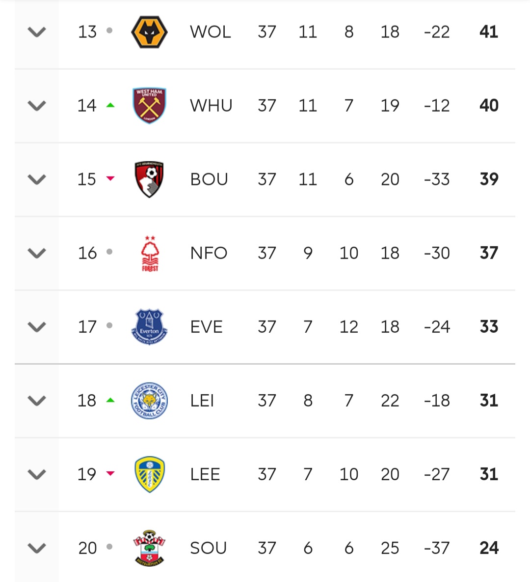 강등팀:사우스햄튼