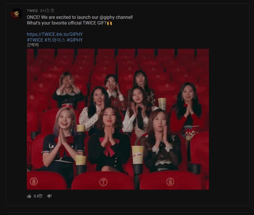 [아이돌]GIPHY (움짤사이트) 만든 트와이스 작성자Slipknot & twice 데이트 주선자|작성시간20.07.31|조회수950 목록 댓글 4 글자크기 작게가 글자크기 크게가 https://giphy.com/twiceofficial 다음검색 현재 게시글 추가 기능 열기 북마크 공유하기 신고 센터로 신고 댓글 댓글 4 댓글쓰기 답글쓰기 댓글 리스트 작성자바이유 | 작성시간 20.07.31 오예 개꿀 ㅅㅅㅅㅅ 작성자유정연 | 작성시간 20.07.31 와 작성자Chelsea | 작성시간 20.07.31 이 사이트 개인채널도 있었구나 작성자Rinus Michels | 작성시간 20.08.24 트와이스 댓글 전체보기