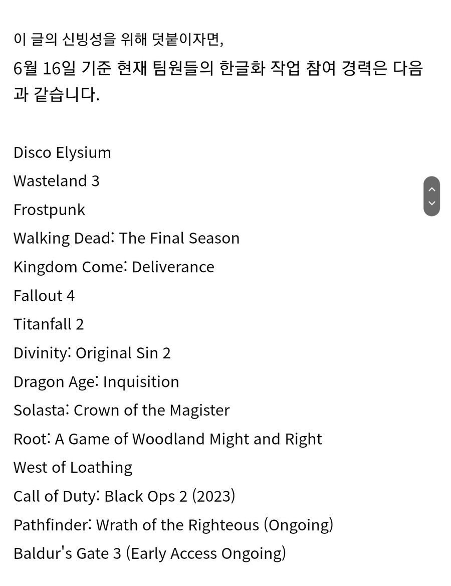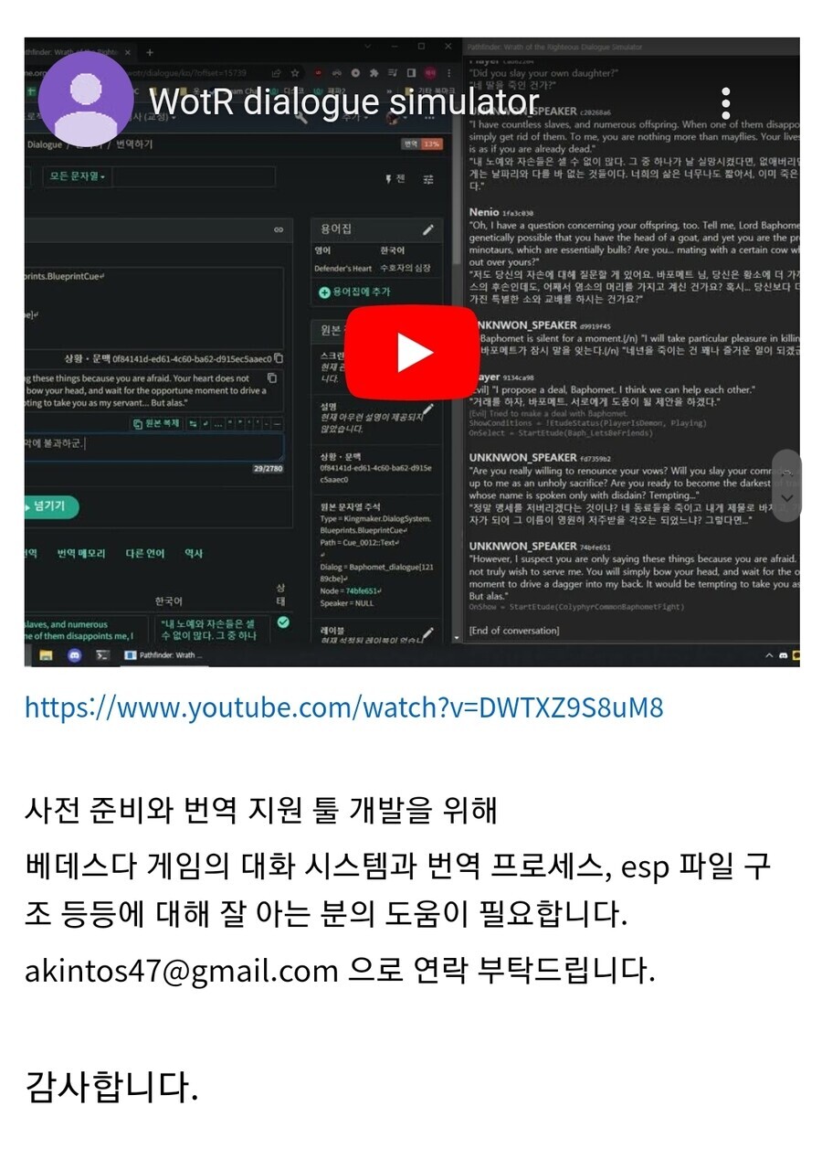 작성자듀레 작성시간 23.06.17 AAA게임을 아직도 무보수로 유저가 번역해야 하는 상황이 참…빨리 공식으로 한글화 이슈 얘기 좀 해줬으면 좋겠네요