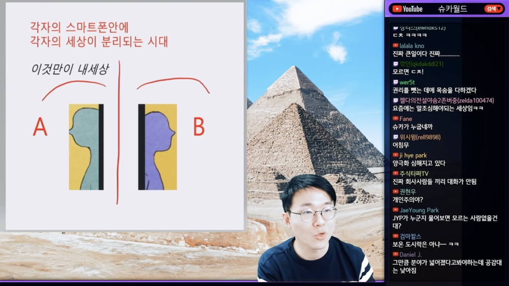 한마디로 각자의 스마트폰 안에 각자의 세상이 분리되는 시대. A랑 B는 한없이 극단으로 가니 대화 자체가 안 된다