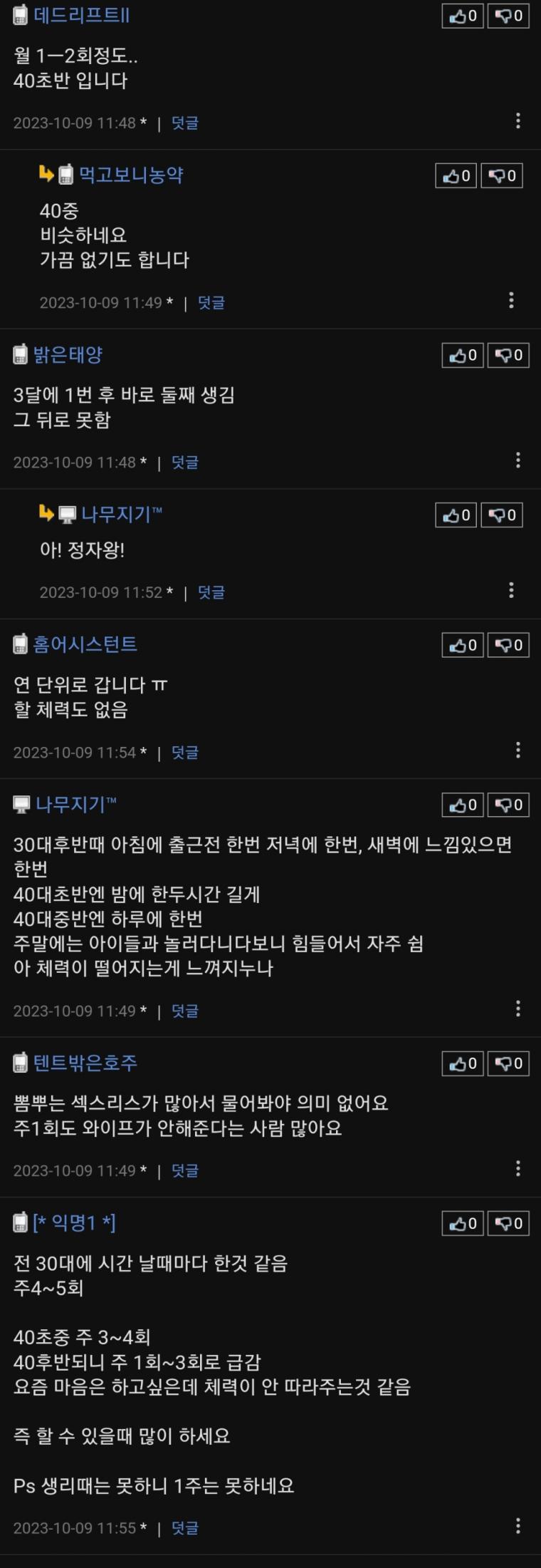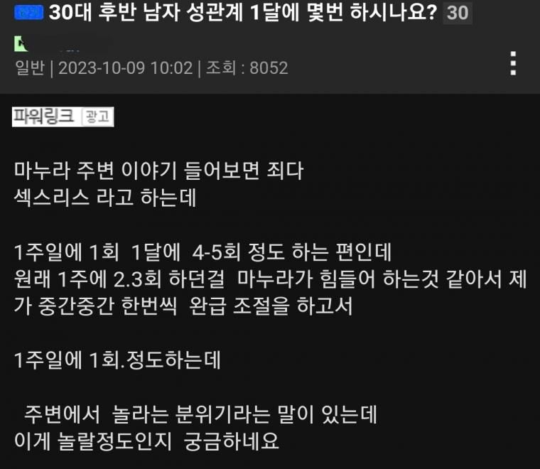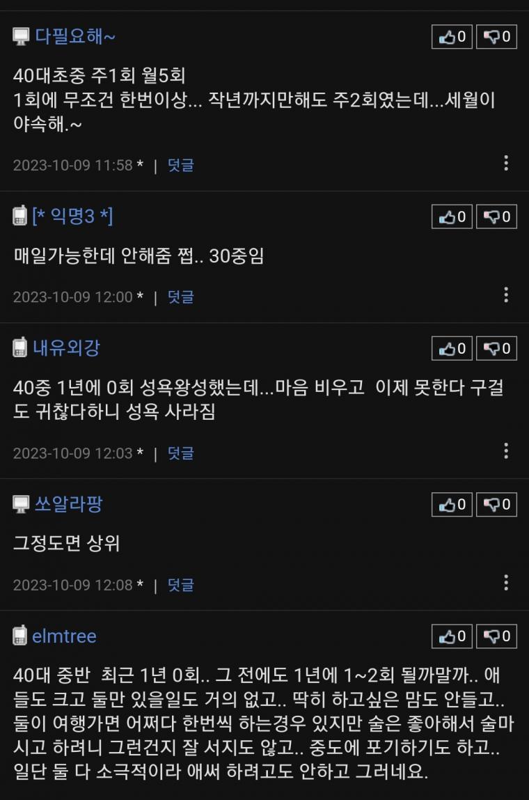 개인적으론 일주일 중 평일엔 한번정도.. 총3번. 아이를 처가로 보내는 주에 2~3번정도..이렇게 한달에 5~6번정도 하는것도 진짜 노력해야 가능하더군요. -