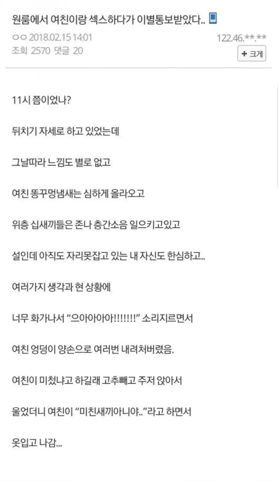 원룸에서 여친이랑 ㅅㅅ하다가 이별 통보 받은 디시인 작성자하얀마음백구|작성시간23.10.16|조회수7,414 목록 댓글 17 글자크기 작게가 글자크기 크게가 다음검색 현재 게시글 추가 기능 열기 북마크 공유하기 신고 센터로 신고 댓글 댓글 17 댓글쓰기 답글쓰기 댓글 리스트 답댓글 작성자땅콩잼잼 | 작성시간 23.10.16 씻었으니깐 아님 그날 응가 안하거나 작성자I.B.I LUV | 작성시간 23.10.16 그림 뭐여 ㅋㅋㅋㅋㅋㅋㅋㅋㅋ 작성자기초 | 작성시간 23.10.16 ㅋㅋㅋㅋㅋㅋㅋ 작성자이나경 | 작성시간 23.10.16 ㅋㅋㅋㅋㅋㅋㅋㅋㅋ 작성자다현 | 작성시간 23.10.16 그림ㅋㅋㅋㅋㅋㅋㅋㅋ 댓글 전체보기