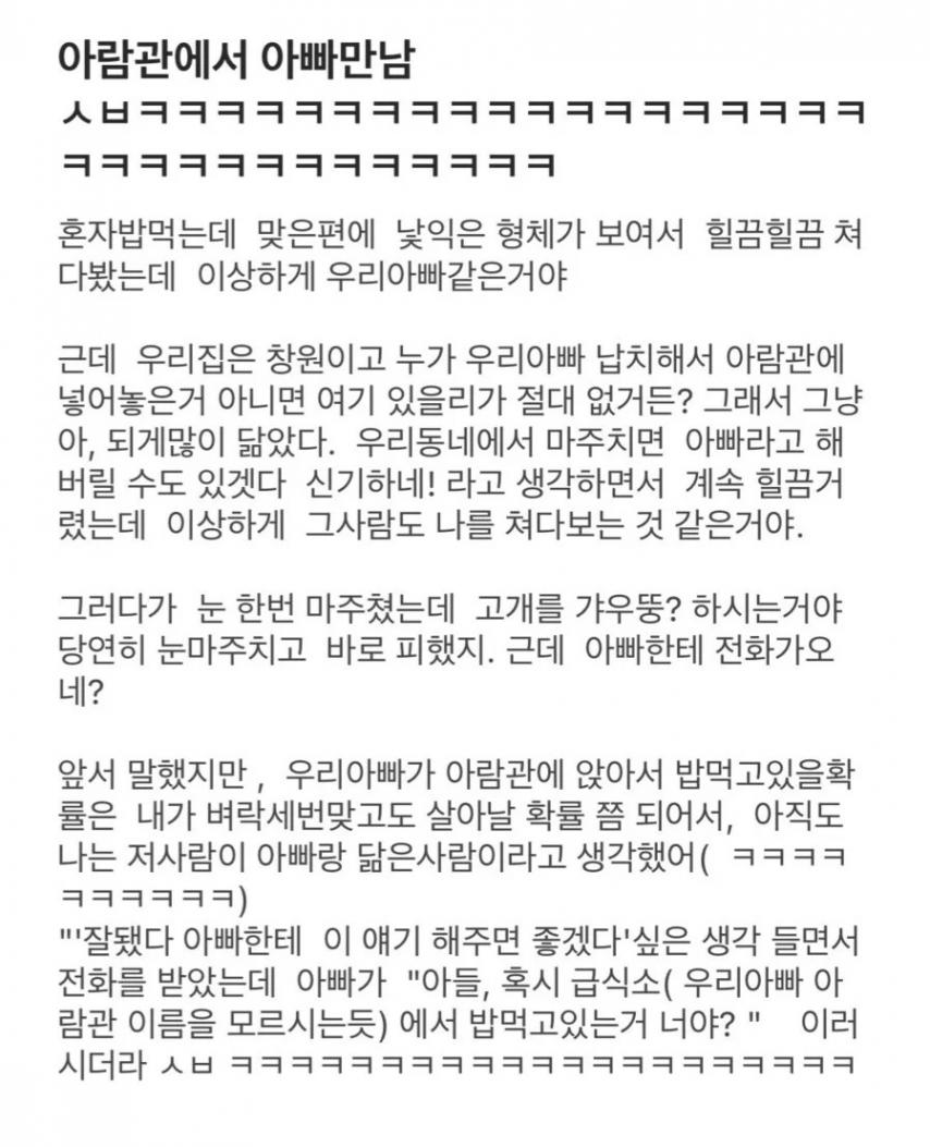 [유머]학생식당에서 아빠 만난 썰.jpg 작성자강동구 주민 1|작성시간23.10.31|조회수18,222 목록 댓글 6 글자크기 작게가 글자크기 크게가 다음검색 현재 게시글 추가 기능 열기 북마크 공유하기 신고 센터로 신고 댓글 댓글 6 댓글쓰기 답글쓰기 댓글 리스트 작성자tnatropmI | 작성시간 23.10.31 ㅎㅎ 작성자그무언가 | 작성시간 23.10.31 아들아 학식 존맛탱이다 집밥보다 맛있다 엄마한텐 비밀이다 답댓글 작성자방패연 | 작성시간 23.10.31 엄마 ~~~ 아빠가 ~~~~ 작성자Dennis Cirkin | 작성시간 23.10.31 학식은 근데 친구들이 먹기 싫어해서 혼밥해야할 때도 있고 뭐 ㅋㅋ 작성자LIVERPOOL FC | 작성시간 23.10.31 혼밥이 젤편함ㅋㅋㅋ 댓글 전체보기