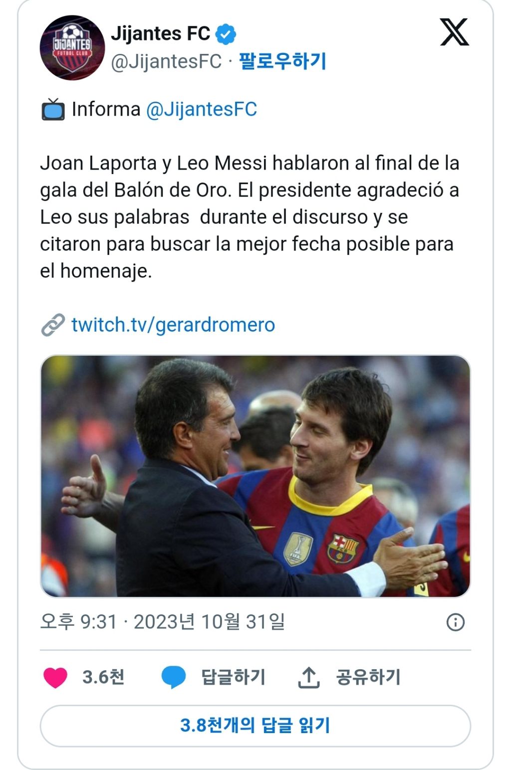 라포르타는 메시의 바르샤 언급에 감사함을 표했고, 고별식을 위한 최적의 일정을 논의하기로 합의함