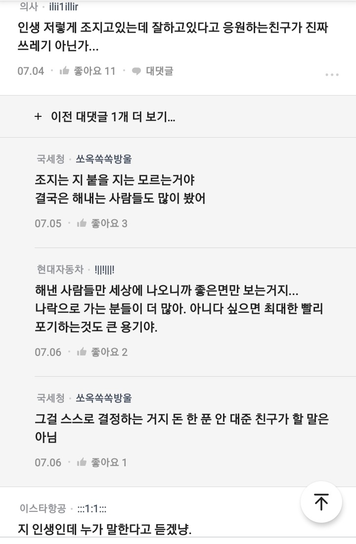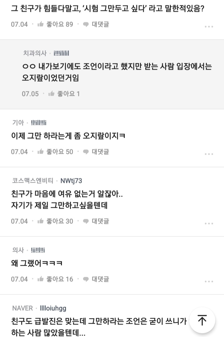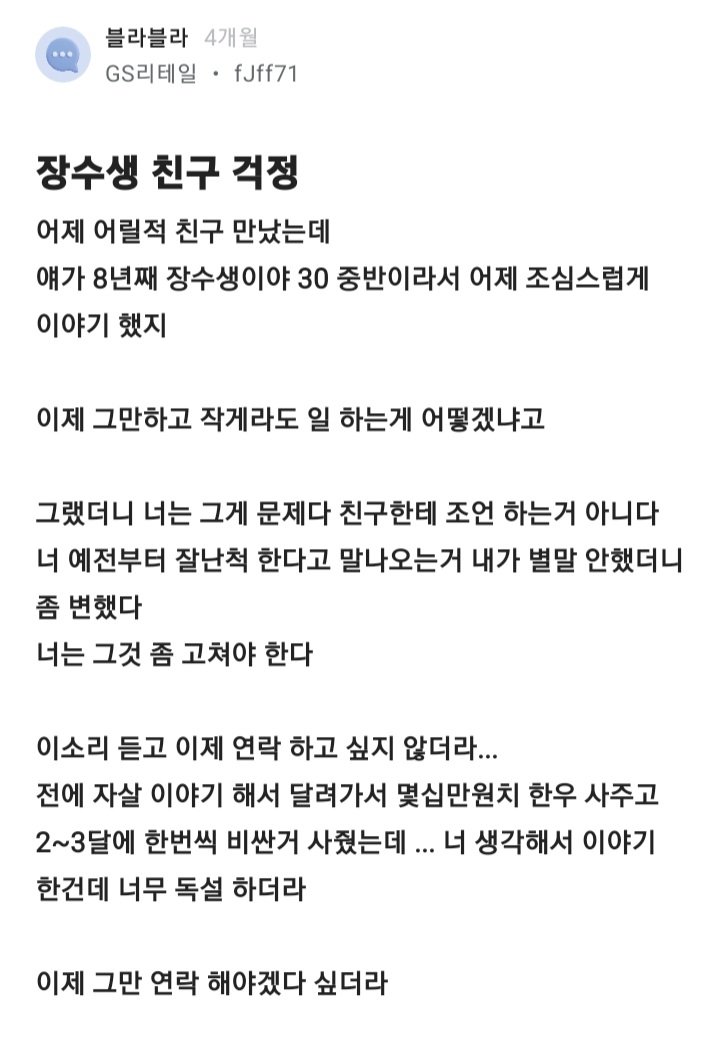작성자우정잉 작성시간 23.11.06 장수생은 저런 친구 놓친거 땅을 치고 후회할거임... 저게 오지랖이면 세상 어떤 말이 조언이겠음