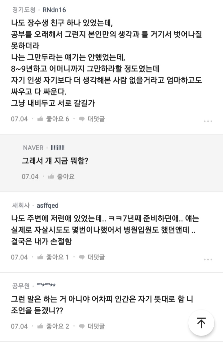 작성자똘깅 작성시간 23.11.06 저 한마디로 장수생 친구가 바뀔거였으면 진작에 공부 때려치고 직장 구했을 듯 ㅋㅋ 8년째 저러고 있는거면 여태 누가 얘기해도 귓등으로 들었을거임. 그냥 암말안하고 지켜보는게 답. 본인이 깨닫기 전까진 절대 그만안둠