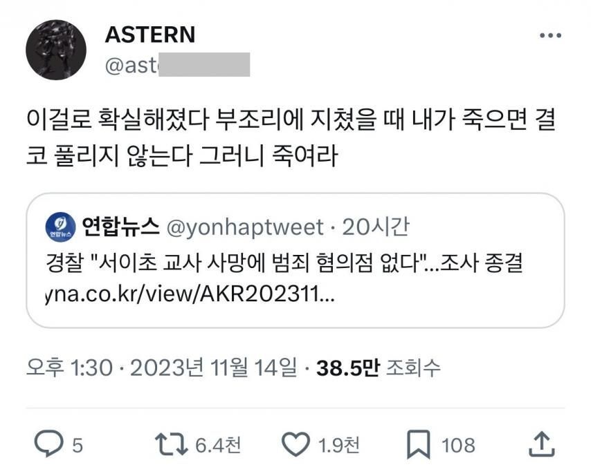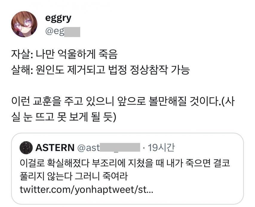 부조리에 대해 자살로는 억울함을 풀 수가 없음 작성자은하|작성시간23.11.15|조회수1,679 목록 댓글 4 글자크기 작게가 글자크기 크게가 다음검색 현재 게시글 추가 기능 열기 북마크 공유하기 신고 센터로 신고 댓글 댓글 4 댓글쓰기 답글쓰기 댓글 리스트 작성자nananana | 작성시간 23.11.15 법이 오히려 사회를 더 험하고 삭막하게 만드네. 진짜 이제는 누군가가 나를 괴롭힌다면 용기내어서 한대라도 쳐야할 듯. 작성자스크류둘 | 작성시간 23.11.15 나도 그냥 죽여버리는게 낫다고봄 내가 왜죽음 그새끼를죽여야지 작성자캐스커 | 작성시간 23.11.15 진짜 자살은 자신만 손해임.. 작성자아넬카 | 작성시간 23.11.15 한극도 총기 합법 국가였으면 진짜 난리 났을듯 댓글 전체보기
