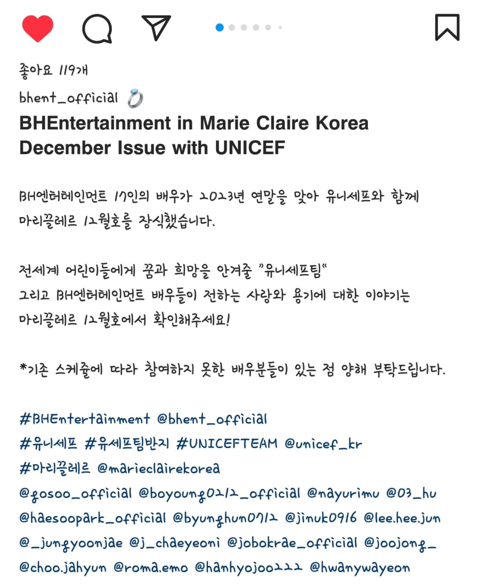BH엔터테인먼트, 마리끌레르 코리아 12월호 (with 유니세프) 작성자리오넬 메갓지민|작성시간23.11.21|조회수926 목록 댓글 14 글자크기 작게가 글자크기 크게가 https://www.instagram.com/p/Cz4yvxtPKrH/?igshid=MzRlODBiNWFlZA==https://www.instagram.com/p/Cz4yrk-PbB1/?igshid=MzRlODBiNWFlZA==https://www.instagram.com/p/Cz4yoEtvaar/?igshid=MzRlODBiNWFlZA== 다음검색 현재 게시글 추가 기능 열기 북마크 공유하기 신고 센터로 신고 댓글 댓글 14 댓글쓰기 답글쓰기 댓글 리스트 작성자MONEY | 작성시간 23.11.21 이병헌 이진욱 소파 투샷 멋지다박보영 귀염 ㅋㅋ 작성자귄터 슈타이너 | 작성시간 23.11.21 김고은 소속사 옮김? 답댓글 작성자MONEY | 작성시간 23.11.21 저기 써 있네요기존 스케줄로 참여 못한 인원들에 김고은 소희 박성훈 한가인 등 유명 소속 연예인들 몇 빠진 듯 작성자이나경 | 작성시간 23.11.21 와ㄷㄷ 작성자다현 | 작성시간 23.11.21 어후 고수 존잘ㄷㄷ 댓글 전체보기