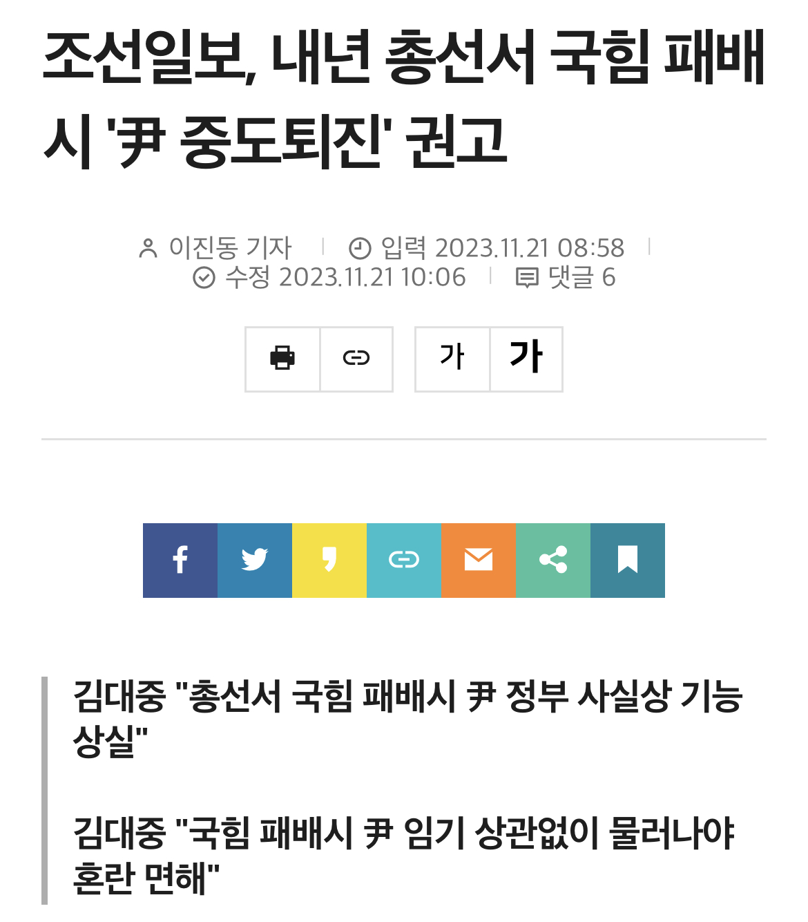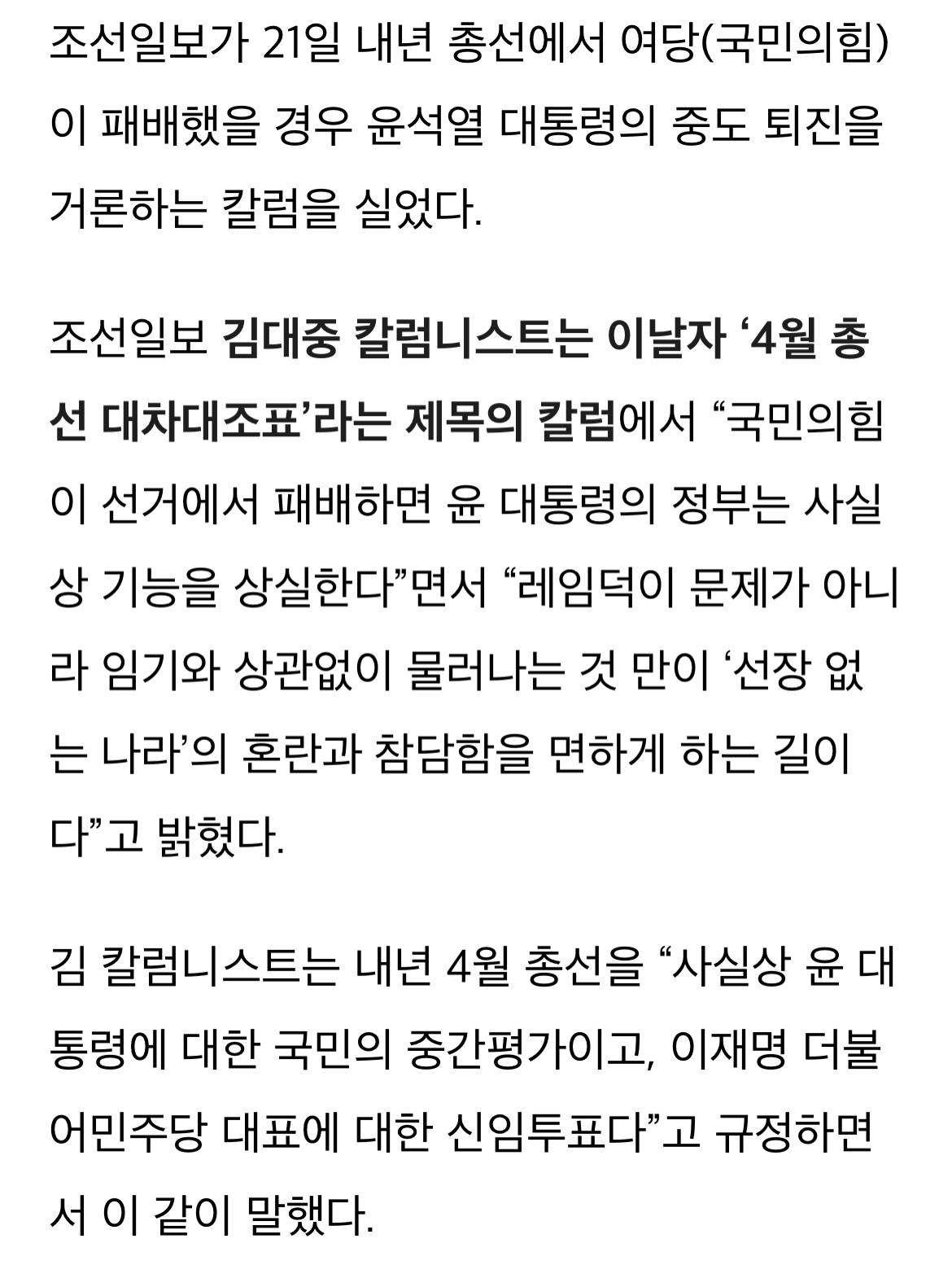 [정치]조선일보, 내년 총선서 국힘 패배시 '윤대통령 중도퇴진' 권고 작성자세단|작성시간23.11.21|조회수1,824 목록 댓글 18 글자크기 작게가 글자크기 크게가 https://www.newsverse.kr/news/articleView.html?idxno=4451 다음검색 현재 게시글 추가 기능 열기 북마크 공유하기 신고 센터로 신고 댓글 댓글 18 댓글쓰기 답글쓰기 댓글 리스트 작성자반박시 님말맞 | 작성시간 23.11.21 검찰공화국 위에 보수언론 작성자낭니 | 작성시간 23.11.21 ㅈㅅ 폐간도 권고하고 싶네 작성자루폴리 | 작성시간 23.11.21 부패수구세력 어셈블 작성자Saints | 작성시간 23.11.21 개웃기넼ㅋㅋㅋ 작성자최유리 | 작성시간 23.11.21 불가능함.. 윤이 망하면 이재명이 이긴다는 이야기인데 이재명은 조선일보 폐간시킨다고 했음.. 댓글 전체보기