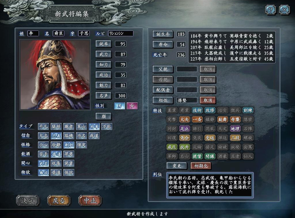 통솔 95, 무력 87, 지력, 79, 정치 35 : 종합 296