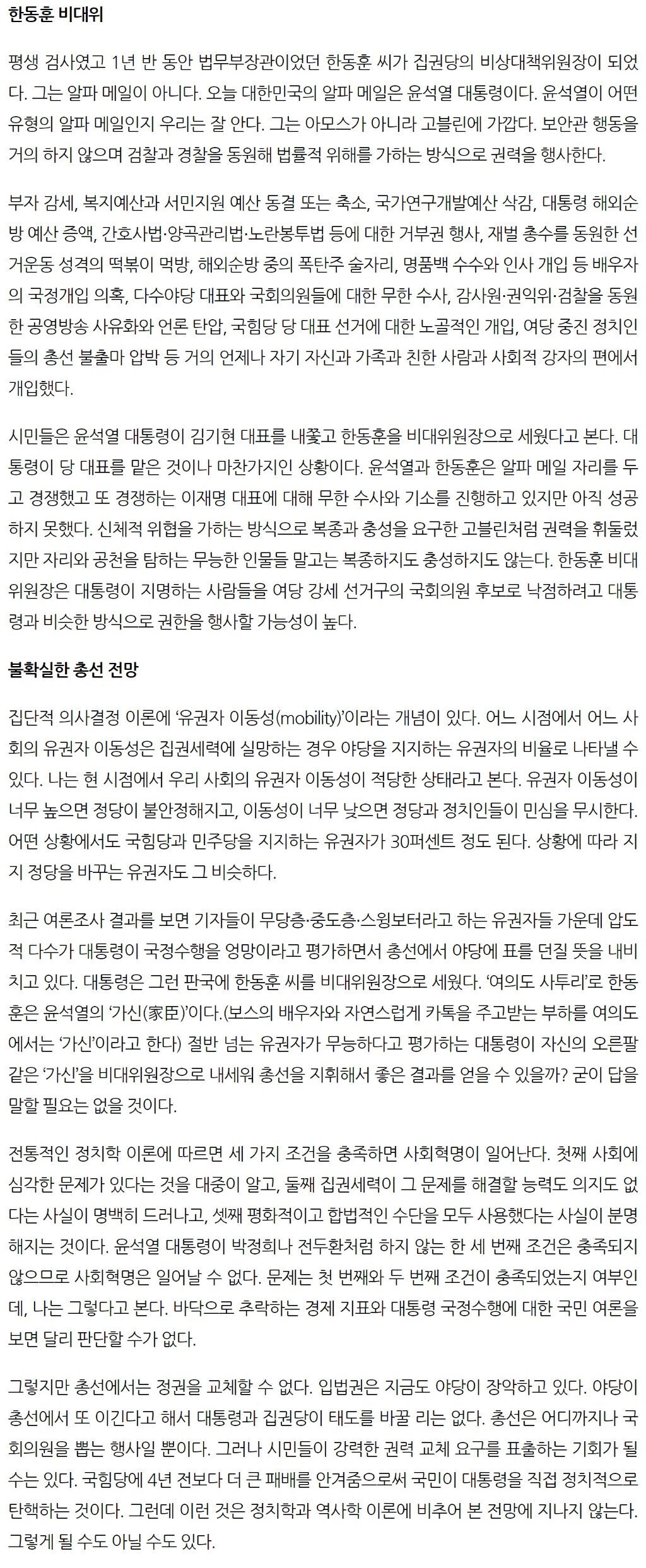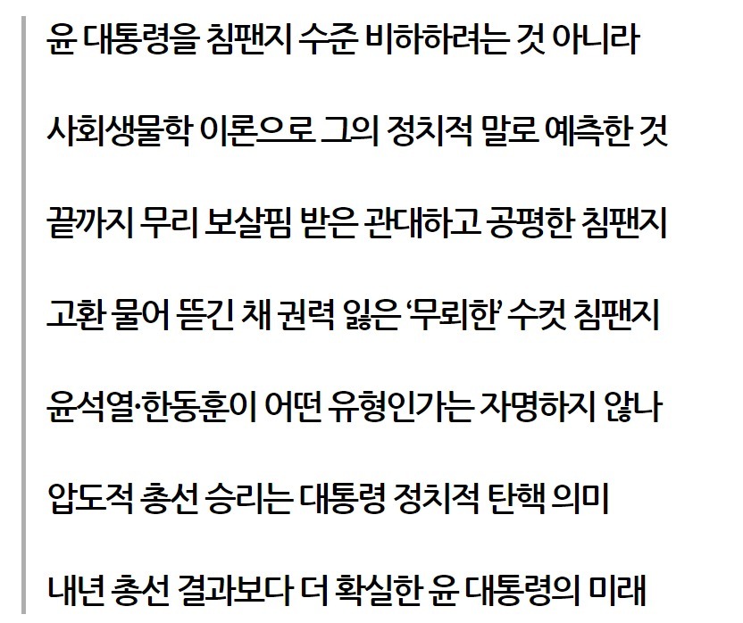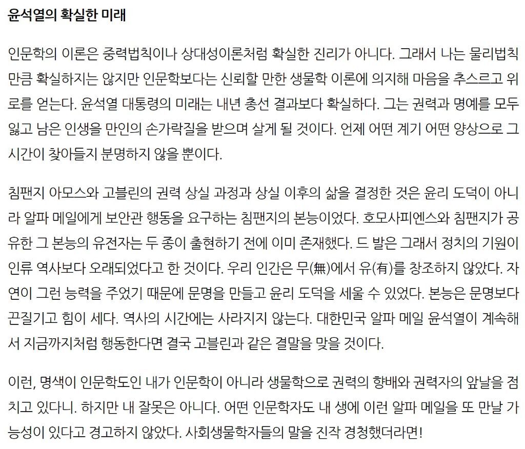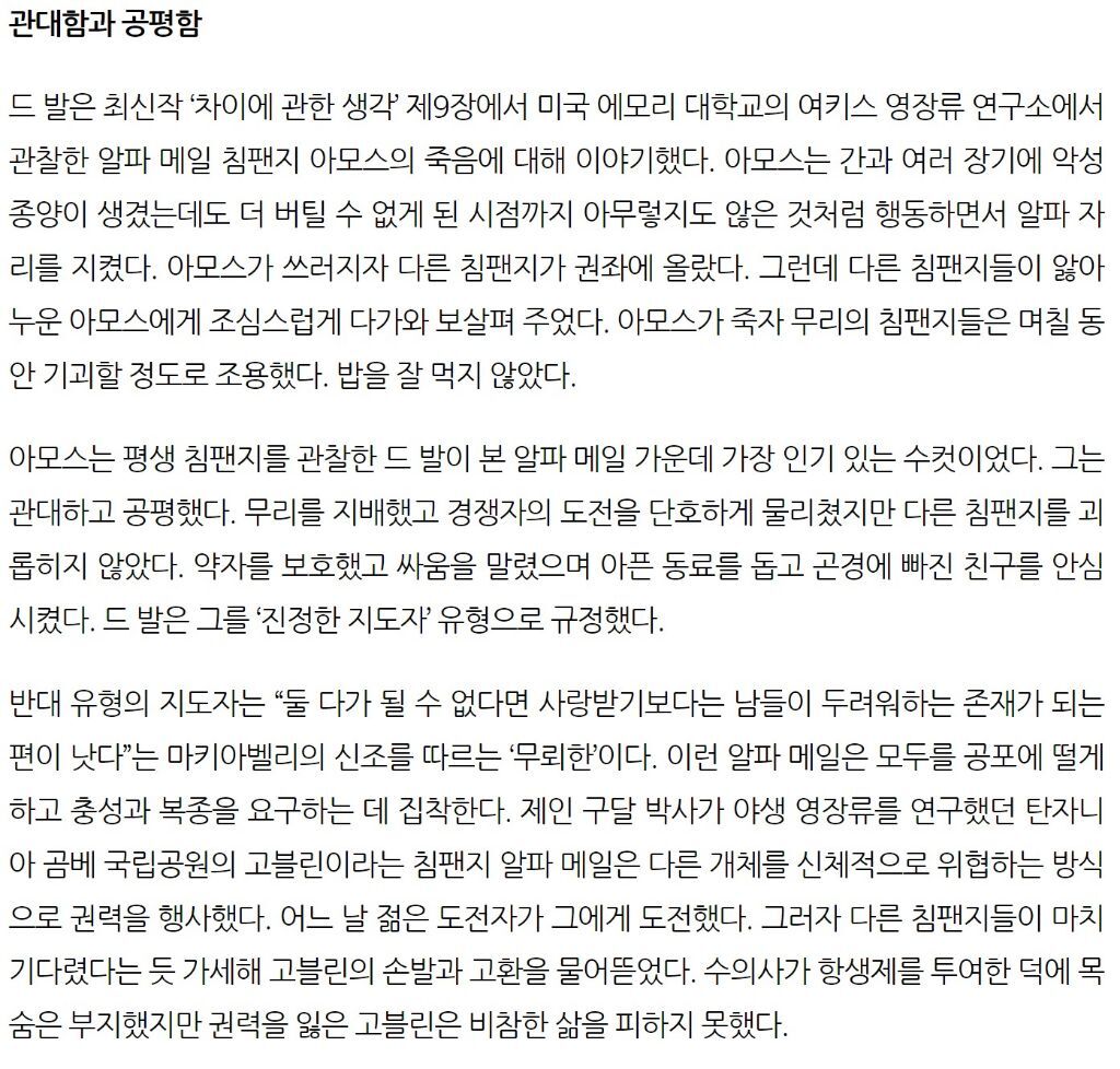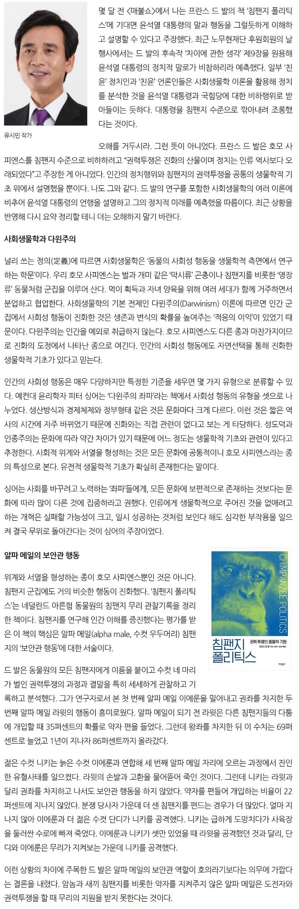 [정치][유시민 칼럼] 다시, '침팬지 폴리틱스' 작성자하얀마음백구|작성시간23.12.26|조회수1,667 목록 댓글 15 글자크기 작게가 글자크기 크게가 https://www.mindlenews.com/news/articleView.html?idxno=6509[유시민 칼럼] 다시, '침팬지 폴리틱스' - 세상을 바꾸는 시민언론 민들레(본 칼럼은 음성으로 들을 수 있습니다.) 몇 달 전 에서 나는 프란스 드 발의 책 ‘침팬지 폴리틱스’에 기대면 윤석열 대통령의 말과 행동을 그럴듯하게 이해하고 설명할 수 있다고 주장했다. www.mindlenews.com 다음검색 현재 게시글 추가 기능 열기 북마크 공유하기 신고 센터로 신고 댓글 댓글 15 댓글쓰기 답글쓰기 댓글 리스트 작성자Google | 작성시간 23.12.26 비꼬기 강등 작성자꿈의극장 | 작성시간 23.12.26 이따 정독할것ㄷㄷㄷ 작성자Arsenal csk | 작성시간 23.12.26 읽어 볼 것 작성자스티븐제라드 | 작성시간 23.12.26 유시민 작성자아몰라@ | 작성시간 23.12.26 나중에 정독해야지 댓글 전체보기