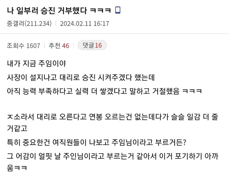 주임에서 대리 승진을 거부한 이유 작성자하얀마음백구|작성시간24.02.15|조회수4,682 목록 댓글 12 글자크기 작게가 글자크기 크게가 주인님~ 다음검색 현재 게시글 추가 기능 열기 북마크 공유하기 신고 센터로 신고 댓글 댓글 12 댓글쓰기 답글쓰기 댓글 리스트 작성자테라마이신안연고 | 작성시간 24.02.15 ㅋㅋㅋㅋㅋㅋㅋㅋㅋㅋㅋㅋㅋㅋ 작성자아메리카노 | 작성시간 24.02.15 ㅋㅋㅋㅋㅋㅋㅋㅋㅋㅋ 작성자내일해야지 | 작성시간 24.02.15 ㅋㅋㅋㅋㅋㅋㅋㅋㅋㅋㅋㅋ 작성자지효 | 작성시간 24.02.15 ㅋㅋㅋ 작성자I.B.I LUV | 작성시간 24.02.15 참 ㅋㅋㅋㅋㅋㅋㅋㅋㅋㅋㅋㅋㅋ 댓글 전체보기