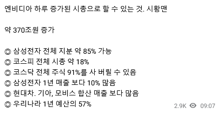 하루동안 증가한 엔비디아 시총 작성자하이드로더치|작성시간24.02.23|조회수3,485 목록 댓글 6 글자크기 작게가 글자크기 크게가 370조원 (2770억 달러)하루 증가량 역대 1위 출처 : 시황맨 다음검색 현재 게시글 추가 기능 열기 북마크 공유하기 신고 센터로 신고 댓글 댓글 6 댓글쓰기 답글쓰기 댓글 리스트 작성자산티아고베르나베우 | 작성시간 24.02.23 갓비디아! 작성자러빗 | 작성시간 24.02.23 주주들은 좋겟다 작성자Paul Dummett | 작성시간 24.02.23 신이야 신 작성자I’d rather be ashes than dust | 작성시간 24.02.23 코인도 아니고 ㄷ ㄷ 작성자아쿤 | 작성시간 24.02.23 내가 왜 안샀을까.....국장 진작에 버릴걸....하..... 댓글 전체보기