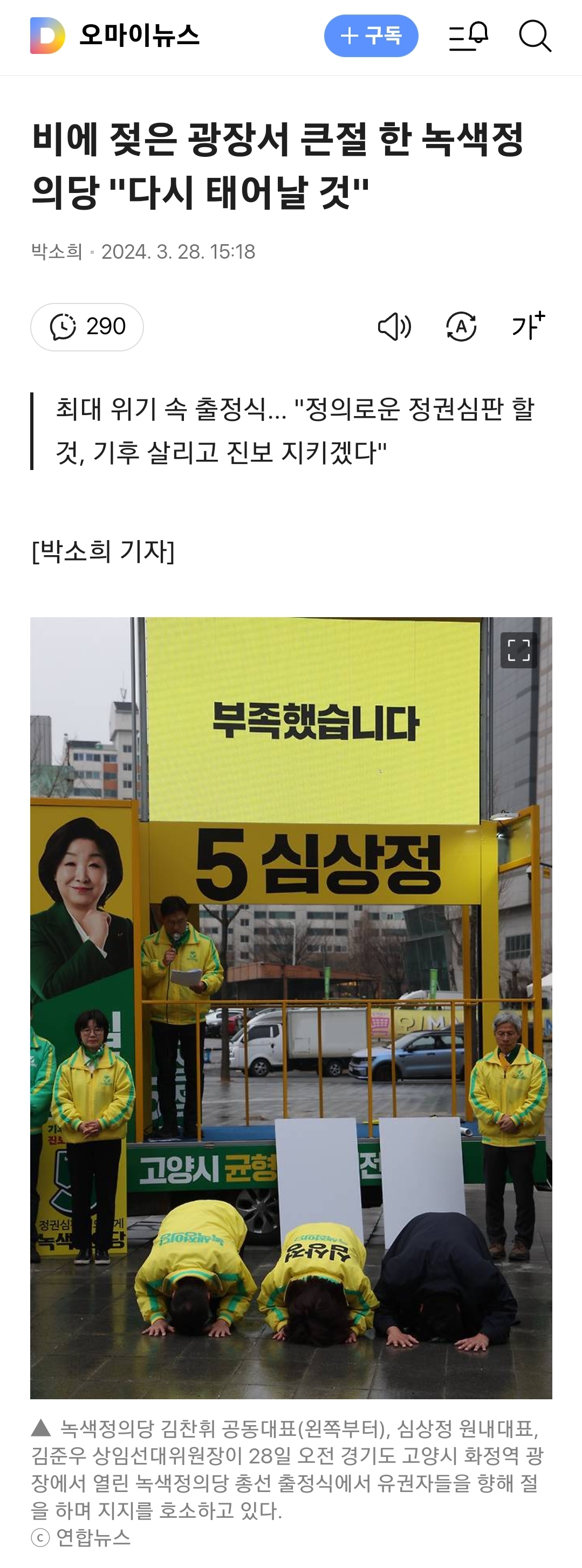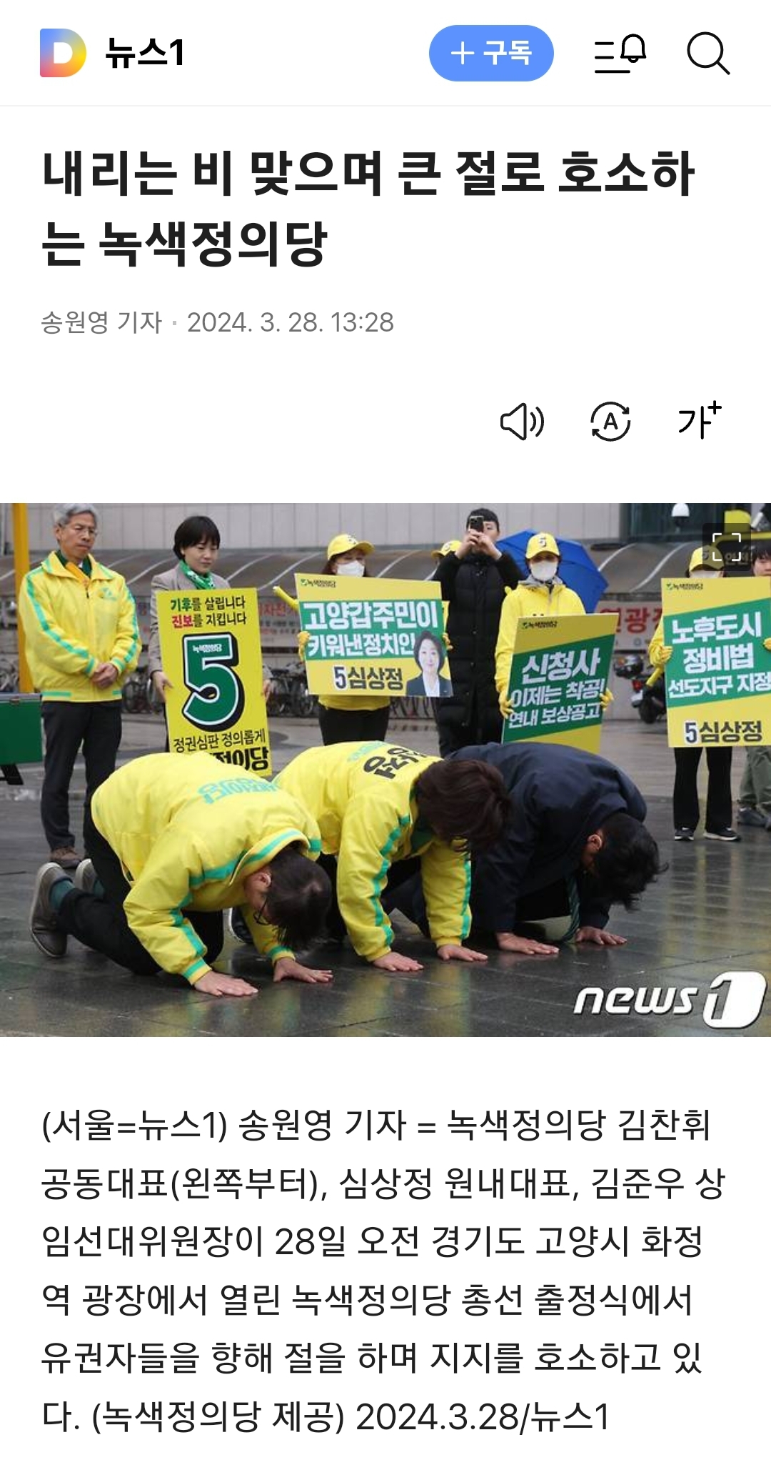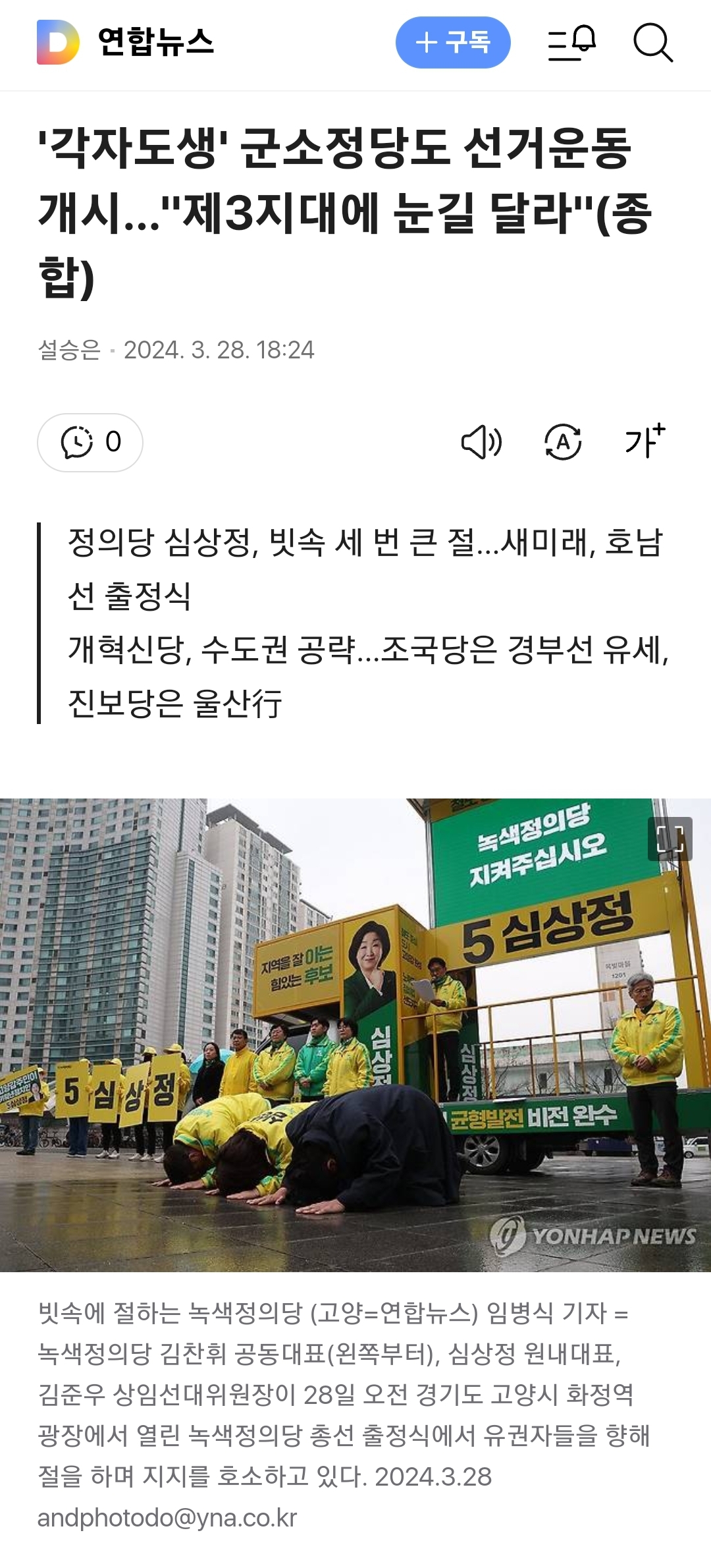 [정치]녹색정의당 근황.jpg 작성자이냥생은처음이라|작성시간24.03.29|조회수2,473 목록 댓글 23 글자크기 작게가 글자크기 크게가 https://v.daum.net/v/20240328132838813내리는 비 맞으며 큰 절로 호소하는 녹색정의당(서울=뉴스1) 송원영 기자 = 녹색정의당 김찬휘 공동대표(왼쪽부터), 심상정 원내대표, 김준우 상임선대위원장이 28일 오전 경기도 고양시 화정역 광장에서 열린 녹색정의당 총선 출정식에서 유v.daum.nethttps://v.daum.net/v/20240328182435149'각자도생' 군소정당도 선거운동 개시…"제3지대에 눈길 달라"(종합)(서울=연합뉴스) 설승은 최평천 기자 = 제3지대 군소정당들은 4·10 총선 공식 선거운동이 개시된 28일 일제히 출정 행사를 열고 유권자들에게 한 표를 호소했다. 윤석열 정권 심판에 한목소리를 v.daum.nethttps://v.daum.net/v/20240328182435149'각자도생' 군소정당도 선거운동 개시…"제3지대에 눈길 달라"(종합)(서울=연합뉴스) 설승은 최평천 기자 = 제3지대 군소정당들은 4·10 총선 공식 선거운동이 개시된 28일 일제히 출정 행사를 열고 유권자들에게 한 표를 호소했다. 윤석열 정권 심판에 한목소리를 v.daum.net 다음검색 현재 게시글 추가 기능 열기 북마크 공유하기 신고 센터로 신고 댓글 댓글 23 댓글쓰기 답글쓰기 댓글 리스트 작성자이나경 | 작성시간 24.03.29 에휴ㅋㅋㅋㅋㅋㅋ 작성자스벅가는서민 | 작성시간 24.03.29 소래포구 작성자전문키커 이세은★ | 작성시간 24.03.29 지겹다 지겨워 작성자ManUtd No.7 | 작성시간 24.03.29 그동안 기회는 충분히 줬다고 생각함민주당 지지자 입장에서 얘네랑 국힘이랑 다를게 뭐임?똑같이 민주당 욕만 하는데 작성자I.B.I LUV | 작성시간 24.03.29 어디서 누군가 하던 걸 하네? ㅋㅋㅋㅋㅋ 댓글 전체보기