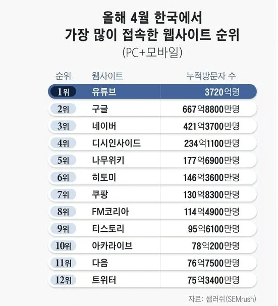 한국에서 가장 많이 접속한 웹사이트 순위 작성자벤피카|작성시간24.07.07|조회수10,199 목록 댓글 19 글자크기 작게가 글자크기 크게가 꺼라 다음검색 현재 게시글 추가 기능 열기 북마크 공유하기 신고 센터로 신고 댓글 댓글 19 댓글쓰기 답글쓰기 댓글 리스트 작성자GENESIS | 작성시간 24.07.07 워닝 어디감 작성자마치영화처럼 | 작성시간 24.07.07 이런 자료는 어디서 찾아볼 수 있나요? 작성자Tensegrity Universe and Philosophy | 작성시간 24.07.07 4위부턴 쿠팡, 다음 빼곤 가본적도 없거나 이름도 첨 듣는 것들이 많네 작성자라다타 | 작성시간 24.07.07 킹무갓키 ㄷㄷ 작성자Messi10 | 작성시간 24.07.08 뭔가 암담한 순위다 ㅠㅠ 댓글 전체보기