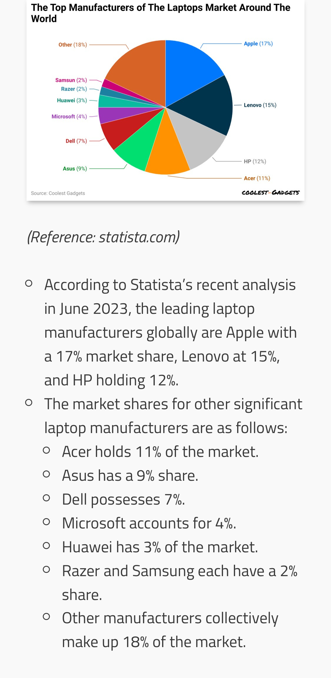 작성자좌정 작성시간 24.07.29 원래 hp, 레노버가 근 10년간 1, 2위였습니다. 애플 마켓셰어가 많이 올라왔네요. 삼성, lg는 원래 글로벌전체시장에서 others로 분류될 만큼 존재감자체가 없었어요. 어떤 점이 의문인지?