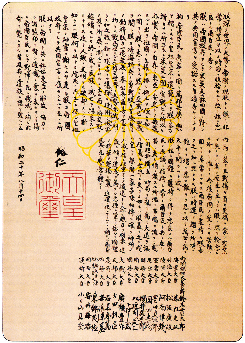 놀랍게도 이게 연합국에 대한 '항복선언 방송'임. '항복'이라던지 '패배'라는 표현 죽어도 쓰기 싫어서 전쟁 정당화로 몸비트는 희대의 개졸렬 항복선언...ㅋㅋ