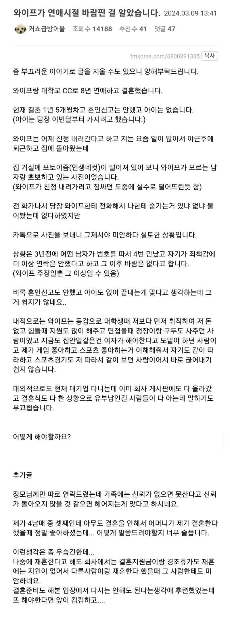 작성시간 24.08.20 세상에 개만도 못한 년놈들이 너무 많아 ㅉㅉ 바람피지말고 걍 정리하고 갈아타라고