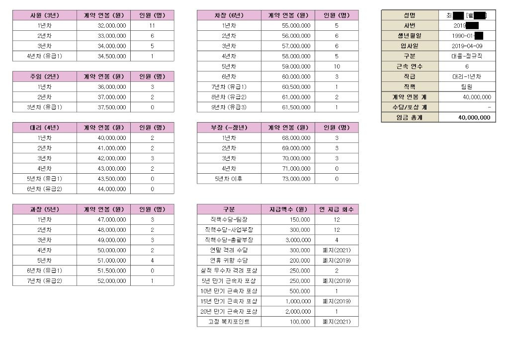 한 중소기업 연봉테이블인데 경리가 실수로 관계자들만 보는 ERP 연봉조회를 직원 전체 다 볼 수 있게 해버려서 유출됨 ㅎㄷㄷ