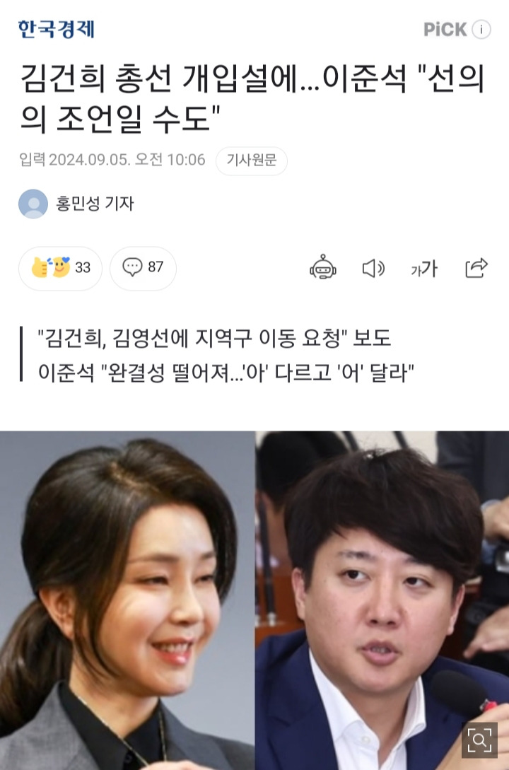 [정치]김건희 총선 개입설에…이준석 "선의의 조언일 수도" 작성자대박나세요모두리치|작성시간24.09.05|조회수2,489 목록 댓글 52 글자크기 작게가 글자크기 크게가 https://n.news.naver.com/article/015/0005030217?sid=100김건희 총선 개입설에…이준석 "선의의 조언일 수도"이준석 개혁신당 의원은 김건희 여사가 지난 4·10 총선 국민의힘 공천에 관여했다는 주장을 실은 보도에 대해 "(공천 개입이 아니라) 선의의 조언일 수도 있는 것"이라고 5일 밝혔다. 김 여사가 5n.news.naver.com 다음검색 현재 게시글 추가 기능 열기 북마크 공유하기 신고 센터로 신고 댓글 댓글 52 댓글쓰기 답글쓰기 댓글 리스트 작성자김밥먹고냠냠 | 작성시간 24.09.05 이준석은 다르다!이준석이 미래다! 작성자탈압박모드리치 | 작성시간 24.09.05 아직 돌아가고 싶구나걍 럭키 안철수여 작성자오이는빼고주세요 | 작성시간 24.09.05 자기 당대표시절 공천에 뭔가 본인도 엮여있거나 돌아가고 싶거나.. 작성자추꾸죠아 | 작성시간 24.09.06 역시 이럴줄 았았징 작성자ppoo | 작성시간 24.09.06 놀랍지도 않다 댓글 전체보기
