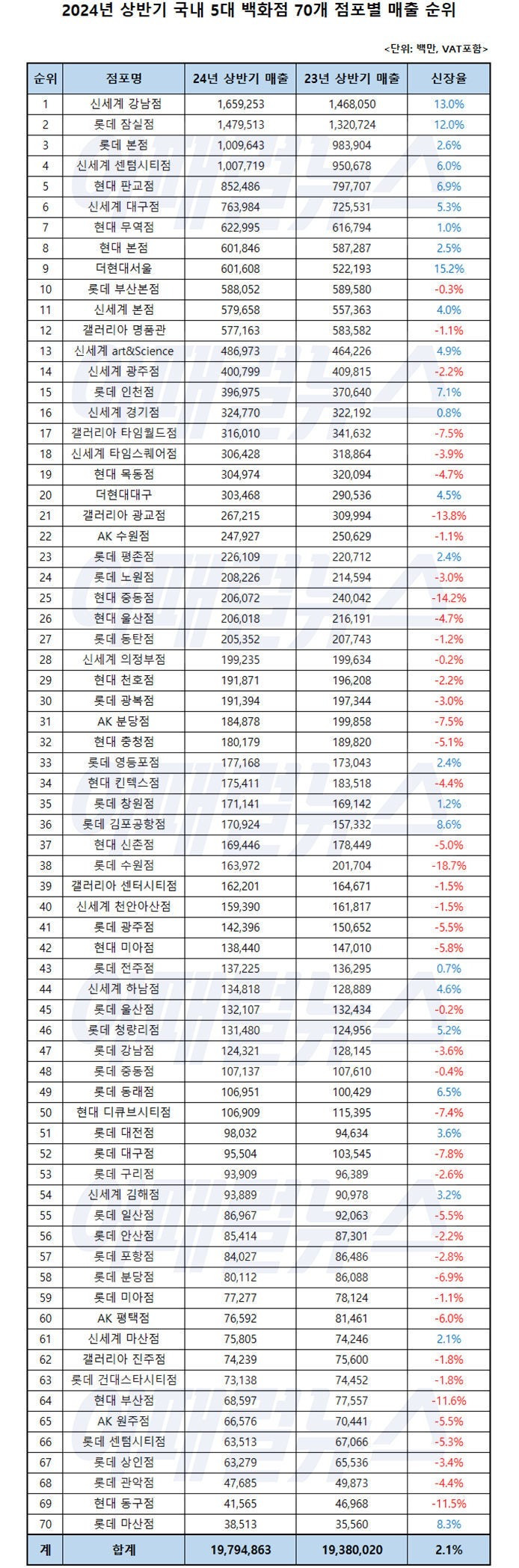 [스크랩] [정보]2024년 상반기 국내 5대 백화점 점포별 매출 순위 작성자민서애비명수|작성시간24.10.08|조회수1,778 목록 댓글 2 글자크기 작게가 글자크기 크게가 1위 : 신세계 강남점 2위 : 롯데 잠실점 3위 : 롯데 본점 4위 : 신세계 센텀시티점 5위 : 현대 판교점 다음검색 스크랩 원문 : 스카이 스크래퍼스 (SKYSCRAPERS) 현재 게시글 추가 기능 열기 북마크 공유하기 신고 센터로 신고 댓글 댓글 2 댓글쓰기 답글쓰기 댓글 리스트 작성자-holic | 작성시간 24.10.08 신세계 강남food court 없어져서 아쉽 ㅠㅠ그거없어지고 다른거 만들어서회전율 높이는것은 이해가 가긴 하는데아니 뭐 주변 음식점이랑 상생도모해서 이해가 가긴하는데 작성자콜 당근 오키 | 작성시간 24.10.08 광복점 사람 겁나 많던데 생각보다 매출이 별로네요 댓글 전체보기