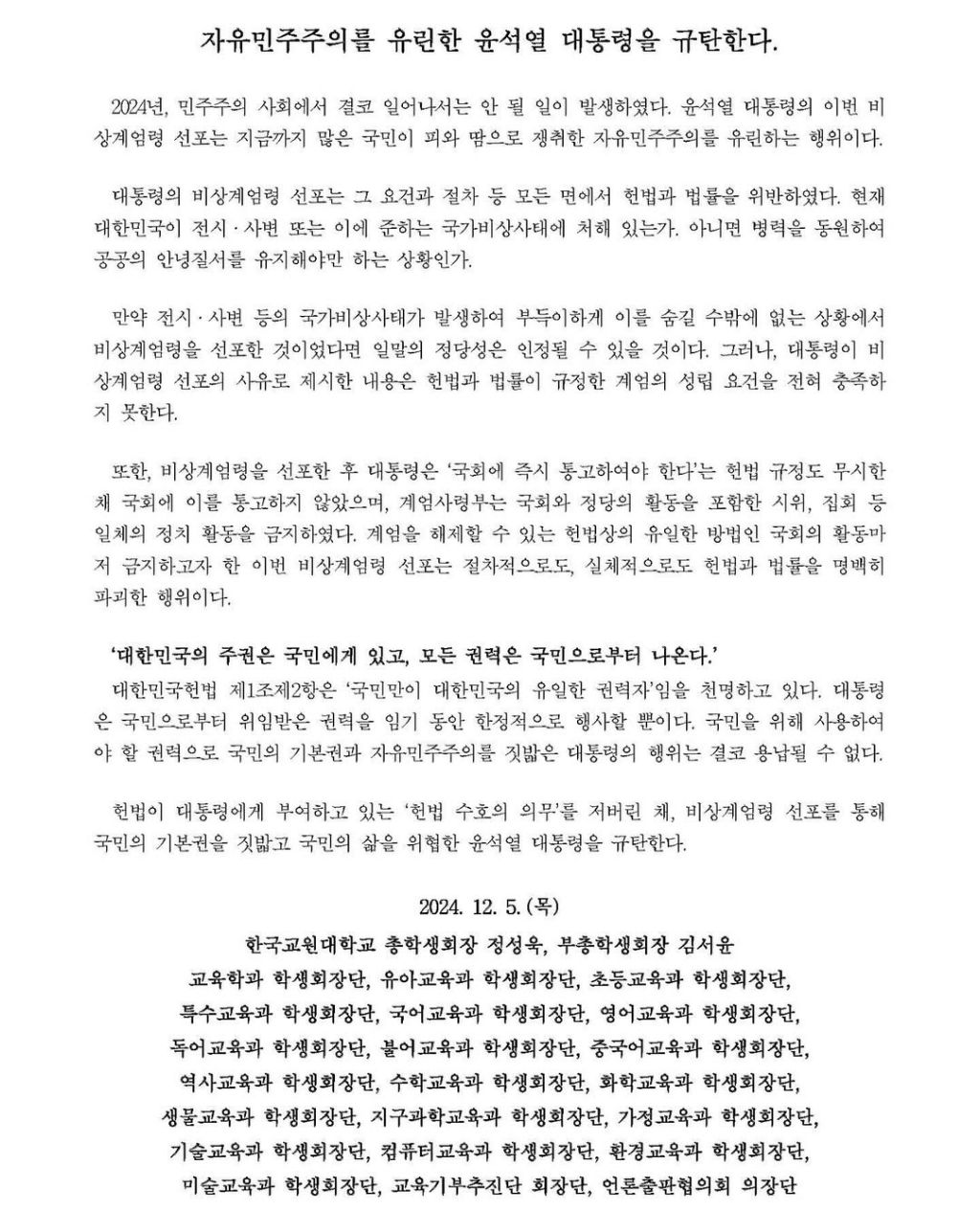 [기타]한국교원대학교 총학생회 성명서 작성자김소원|작성시간24.12.06|조회수953 목록 댓글 1 글자크기 작게가 글자크기 크게가 현재 교대련도 준비중tmi 한국교원대는 사범대+교대...종합대인데 종합대아닌느낌 다음검색 현재 게시글 추가 기능 열기 북마크 공유하기 신고 센터로 신고 댓글 댓글 1 댓글쓰기 답글쓰기 댓글 리스트 작성자흐어엉어어 | 작성시간 24.12.06 고맙습니다.... 댓글 전체보기