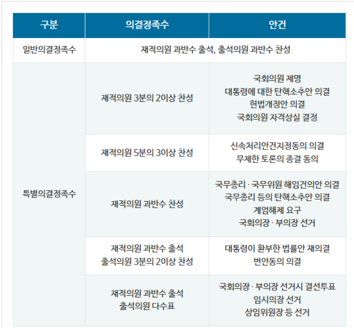 이외에도 재적 과반수 찬성/ 재적 3/5이상 찬성 등이 필요한 정족수가 있습니다.