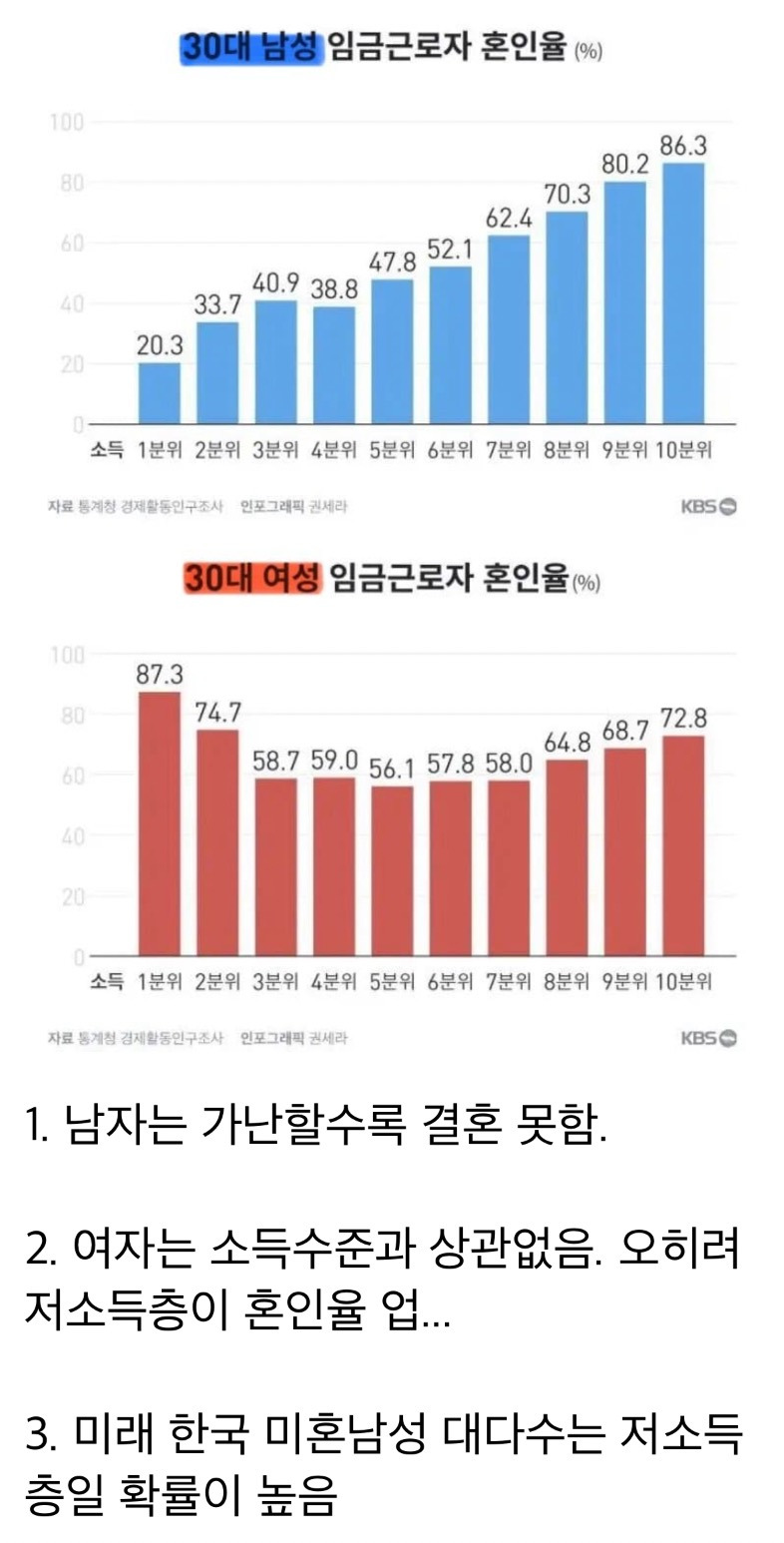 작성자대전타슈 작성시간 24.12.31 여성 그래프도 저소득층 혼인율이 높은건 저소득층 상태에서 결혼해서가 아니라 결혼 후 경력단절이 된 상태에서 다시 생업에 뛰어들어서 그렇다더군요. 그러니까 여성도 결국 소득이 높을 수록 혼인율이 높다는 말이 된답니다. 물론 남성보다 그 경향이 다소 약하긴 하지만요