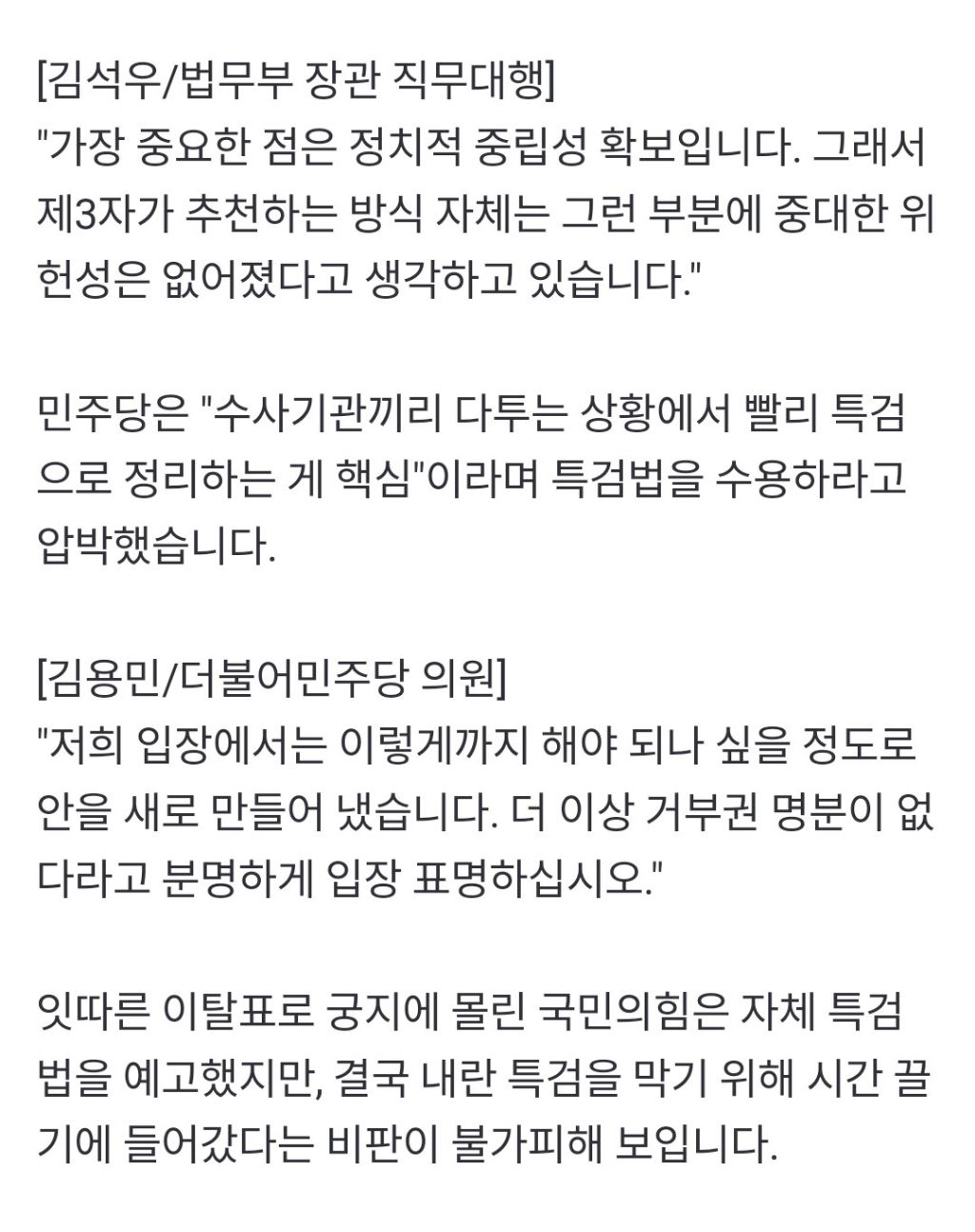 [기사]'제 3자 추천' 내란 특검도 반대하는 여당‥법무차관조차 "위헌성 해소 작성자러바오|작성시간25.01.10|조회수1,075 목록 댓글 6 글자크기 작게가 글자크기 크게가 https://n.news.naver.com/article/214/0001399329?sid=100'제 3자 추천' 내란 특검도 반대하는 여당‥법무차관조차 "위헌성 해소◀ 앵커 ▶ 여당의 요구를 대폭 수용한 두 번째 내란특검법을 두고도, 국민의힘은 수사대상이 광범위하다면서 반대하겠다는 뜻을 밝혔습니다. 이 또한, 사실상 시간 끌기에 들어가겠다는 걸로 n.news.naver.com 다음검색 현재 게시글 추가 기능 열기 북마크 공유하기 신고 센터로 신고 댓글 댓글 6 댓글쓰기 답글쓰기 댓글 리스트 작성자개밥 | 작성시간 25.01.10 누가봐도 시간끌기 양아치 짓거리만 주구장창 내란공범 작성자겨울노을 | 작성시간 25.01.10 저정도면 200이상 나올것임아예 표결참여안하는거아니면 200이상나옴 작성자aespa 윈터 | 작성시간 25.01.10 위헌 쓰레기 정당 작성자드림캐쳐 다미 | 작성시간 25.01.10 그냥 다 싫은거지 뭐 작성자소나기 | 작성시간 25.01.10 ??? : 위헌적 요소가 있는 특검법. 여.야가 합의해야.. . 댓글 전체보기