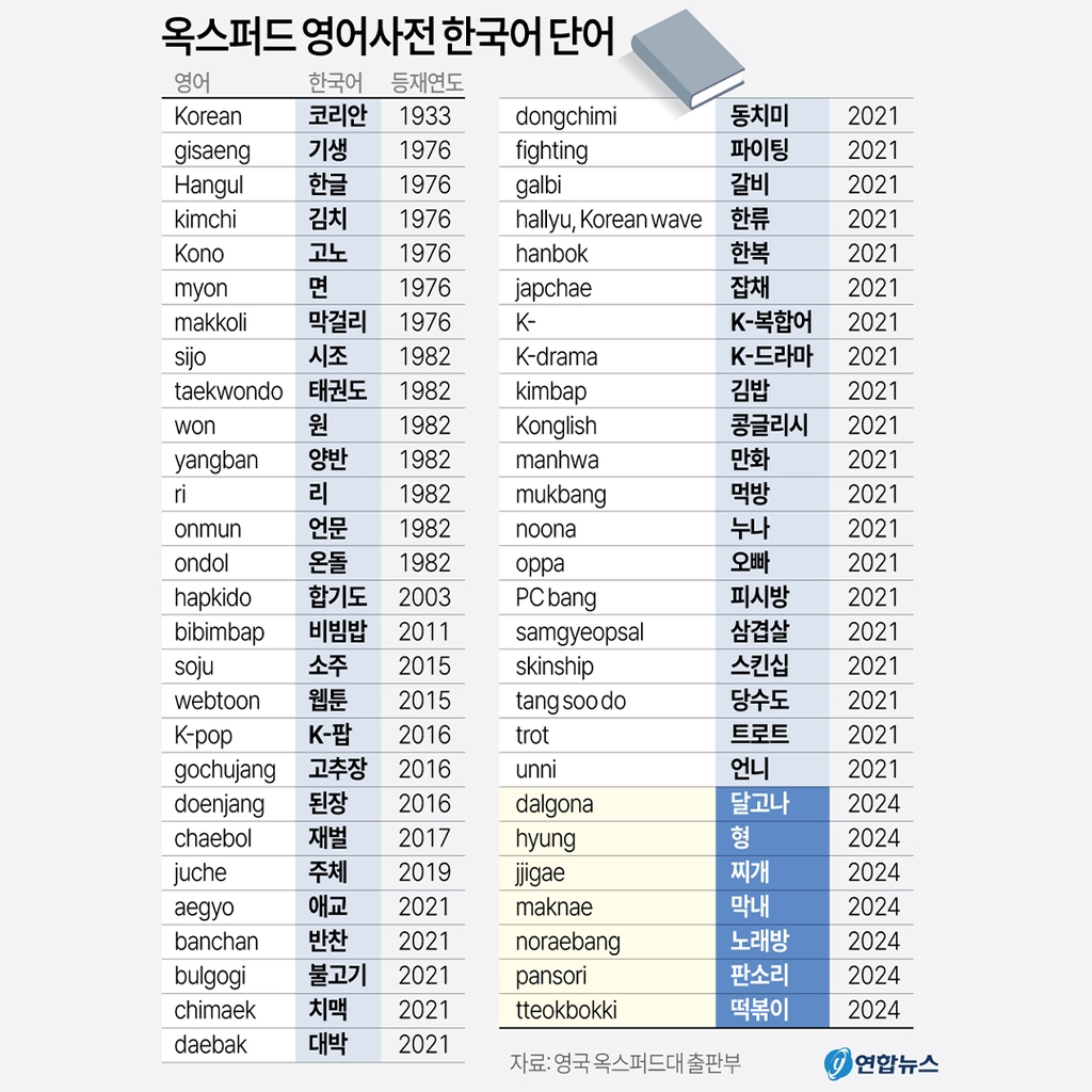 옥스퍼드 영어사전에 등재된 한국어 단어 작성자가을날3|작성시간25.01.11|조회수1,198 목록 댓글 5 글자크기 작게가 글자크기 크게가 출처 연합뉴스 다음검색 현재 게시글 추가 기능 열기 북마크 공유하기 신고 센터로 신고 댓글 댓글 5 댓글쓰기 답글쓰기 댓글 리스트 작성자짤순태 | 작성시간 25.01.11 왜 누나 언니 오빠는 실렸는데 형만 늦게실렸지ㅋㅋ 작성자치얼스 | 작성시간 25.01.11 기발 씨훈이형!! 작성자연필깎이 | 작성시간 25.01.11 고노가 아니고 고누 작성자FC서울 알레~ | 작성시간 25.01.11 당수도가 왜 탕수도야?ㅠ 작성자Tensegrity Universe and Philosophy | 작성시간 25.01.11 재벌은 체벌 댓글 전체보기