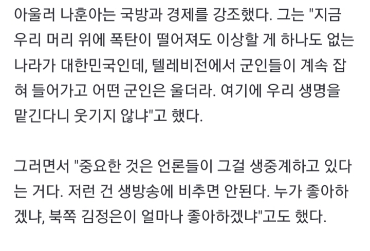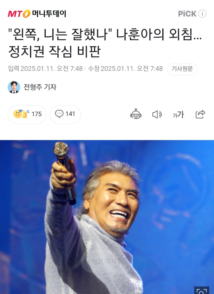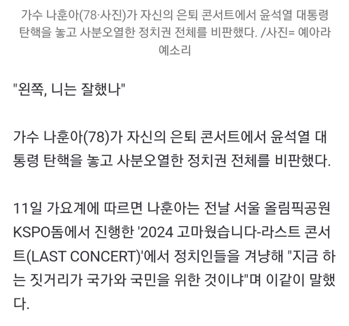 [기사]"왼쪽, 니는 잘했나" 나훈아의 외침 작성자대박나세요모두리치|작성시간25.01.11|조회수4,175 목록 댓글 63 글자크기 작게가 글자크기 크게가 https://n.news.naver.com/article/008/0005139716?sid=102"왼쪽, 니는 잘했나" 나훈아의 외침…정치권 작심 비판"왼쪽, 니는 잘했나" 가수 나훈아(78)가 자신의 은퇴 콘서트에서 윤석열 대통령 탄핵을 놓고 사분오열한 정치권 전체를 비판했다. 11일 가요계에 따르면 나훈아는 전날 서울 올림픽공원 KSPO돔에서n.news.naver.com 다음검색 현재 게시글 추가 기능 열기 북마크 공유하기 신고 센터로 신고 댓글 댓글 63 댓글쓰기 답글쓰기 댓글 리스트 작성자Wayne Rooney | 작성시간 25.01.11 역시 테스형 노래 보유자 ㄷㄷ 작성자I.B.I LUV | 작성시간 25.01.11 양비론 생각은 최악이네..... 윤씨가 계엄 일으키려고 한게 미친건데 작성자1합시다 | 작성시간 25.01.11 무식하면 빨리 가 작성자베토벤 | 작성시간 25.01.11 대갈 텅텅이네 ㅋㅋㅋㅋㅋㅋㅋ 작성자문리할 | 작성시간 25.01.11 ㅋㅋㅋㅋ 욕 개 쳐묵네 ㅋㅋㅋ 댓글 전체보기