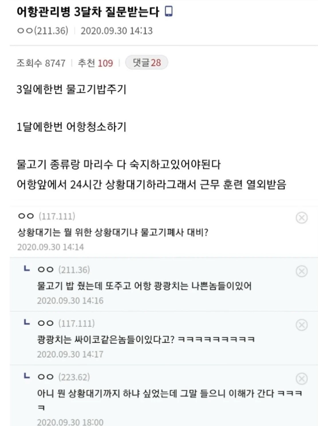 군대에 진짜 있다는 보직 작성자하얀마음흑구|작성시간25.01.13|조회수2,459 목록 댓글 5 글자크기 작게가 글자크기 크게가 어항관리병 다음검색 현재 게시글 추가 기능 열기 북마크 공유하기 신고 센터로 신고 댓글 댓글 5 댓글쓰기 답글쓰기 댓글 리스트 작성자사자 | 작성시간 25.01.13 개부럽네 ㅋㅋㅋㅋㅋㅋㅋㅋ 작성자마일즈 모랄레스 | 작성시간 25.01.13 ㅋㅋㅋㅋㅋㅋㅋㅋㅋㅋㅋㅋ 작성자올리브영 지루 | 작성시간 25.01.13 어항이 있었나 작성자최남라 | 작성시간 25.01.14 붕어방뼝 생각나네 작성자라스무스 호일룬 | 작성시간 25.01.14 시설관리도 안되는 폐급 붕어빵병 시키던데 댓글 전체보기