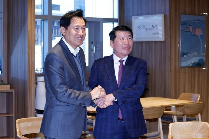 오세훈 서울시장과 백경현 구리시장이 지난 2023년 서울시청에서 구리시의 서울시 편입 문제 등에 대해 논의하기 앞서 악수하고 있다. 공동취재