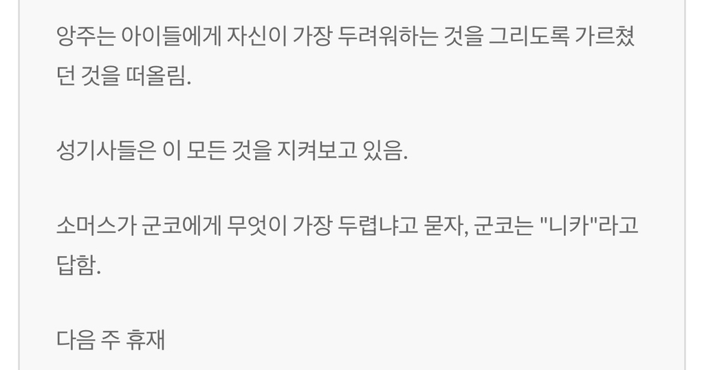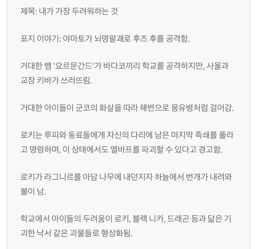 [스포주의]원피스 1142 짧은 글 스포 작성자가을날3|작성시간25.03.06|조회수1,072 목록 댓글 4 글자크기 작게가 글자크기 크게가 다음검색 현재 게시글 추가 기능 열기 북마크 공유하기 신고 센터로 신고 댓글 댓글 4 댓글쓰기 답글쓰기 댓글 리스트 작성자인생은타이밍 | 작성시간 25.03.06 다음주 휴재ㅠ 작성자federation | 작성시간 25.03.06 개인적으로 이 거인족편 사무라이때보다 집중도 안되고 재미없는거같음 답댓글 작성자라라라랄나 | 작성시간 25.03.06 2222 작성자Daniel Agger | 작성시간 25.03.06 로키는 결국 같은편되는 그림일라나 댓글 전체보기