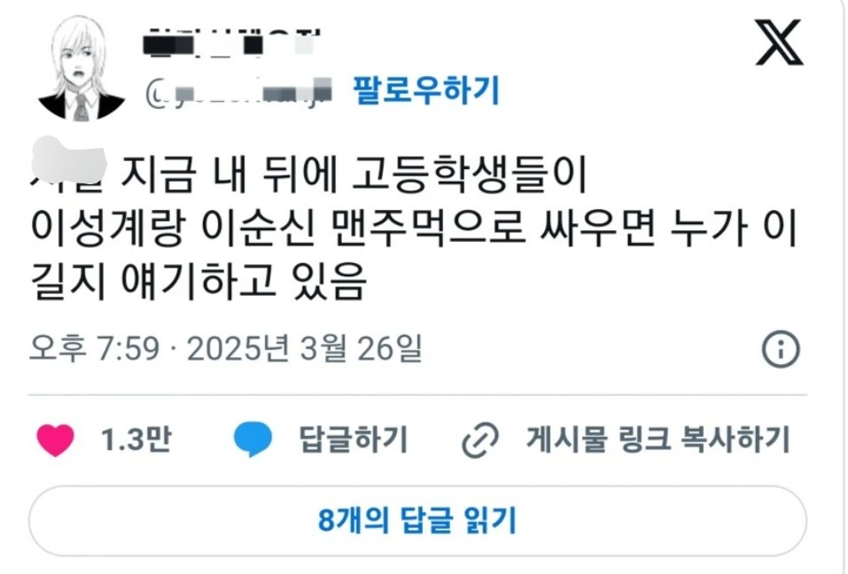 樂soccer 요즘 고등학생의 대화 수준 작성시간25.04.03|조회수42,946 목록 댓글 27 글자크기 작게가 글자크기 크게가 다음검색 현재 게시글 추가 기능 열기 북마크 공유하기 신고 센터로 신고 댓글 27 댓글 리스트 작성시간 25.04.03 저는 예전부터 궁금했던 거윤석열이랑 김정은이랑 맨손으로 싸우면 누가 이길까?같은 돼지이지만어퍼컷은 윤석열이 잘하지만 나이는 김정은이 젊으니... 답댓글 작성시간 25.04.03 이미지 확대 작성시간 25.04.03 맨주먹은 이성계가 이길듯 작성시간 25.04.03 ㅋㅋㅋㅋㅋㅋㅋ 작성시간 25.04.12 이순신은 덱스캐라 ㄷㄷ 카페 방문해 더 많은 댓글 만나기!