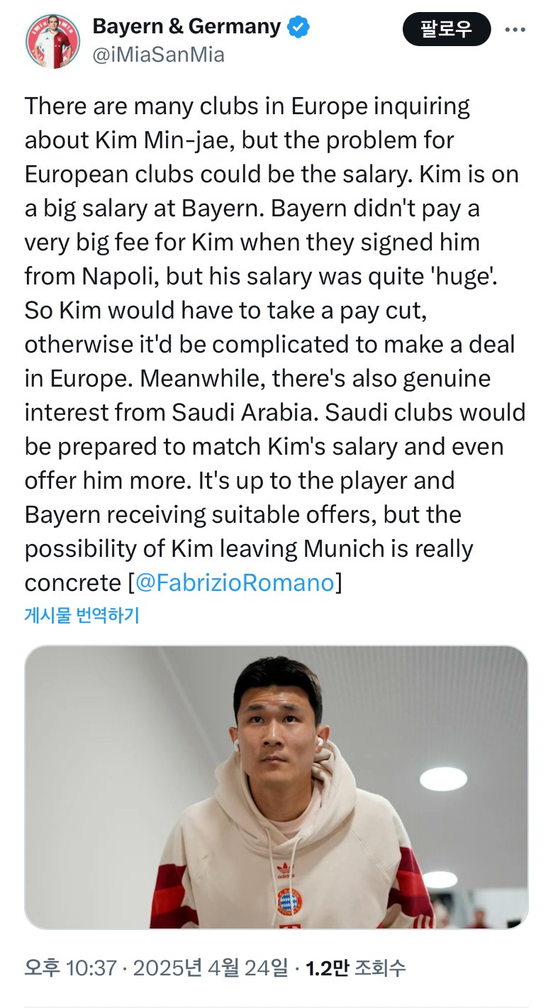 樂soccer [로마노] 김민재 문의하는 구단 많다 작성시간25.04.24|조회수6,832 목록 댓글 10 글자크기 작게가 글자크기 크게가 https://x.com/iMiaSanMia/status/1915399586463576479X의 Bayern & Germany님(@iMiaSanMia)There are many clubs in Europe inquiring about Kim Min-jae, but the problem for European clubs could be the salary. Kim is on a big salary at Bayern. Bayern didn't pay a very big fee for Kim when they signed him from Napoli, but his salary was quite 'huge'x.com 다음검색 현재 게시글 추가 기능 열기 북마크 공유하기 신고 센터로 신고 댓글 10 댓글 리스트 작성시간 25.04.25 리버풀아 사줘 ㅠㅠ 작성시간 25.04.25 시티 가서 후사노프 못 밀어 내려나 답댓글 작성시간 25.04.26 시티가면 유니폼 사야징 작성시간 25.04.25 나갈확률이 꽤 되나 보군요 작성시간 25.04.25 스페인, 프랑스, 이탈리아 같은 남유럽쪽이 스타일상 맞을거 같은데.. 카페 방문해 더 많은 댓글 만나기!