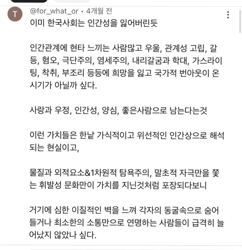 작성시간 25.04.28 먹고사는건 엄청난 선진국인데 그외는 꽤나 후진적임. 철학이 많이 부족한듯..