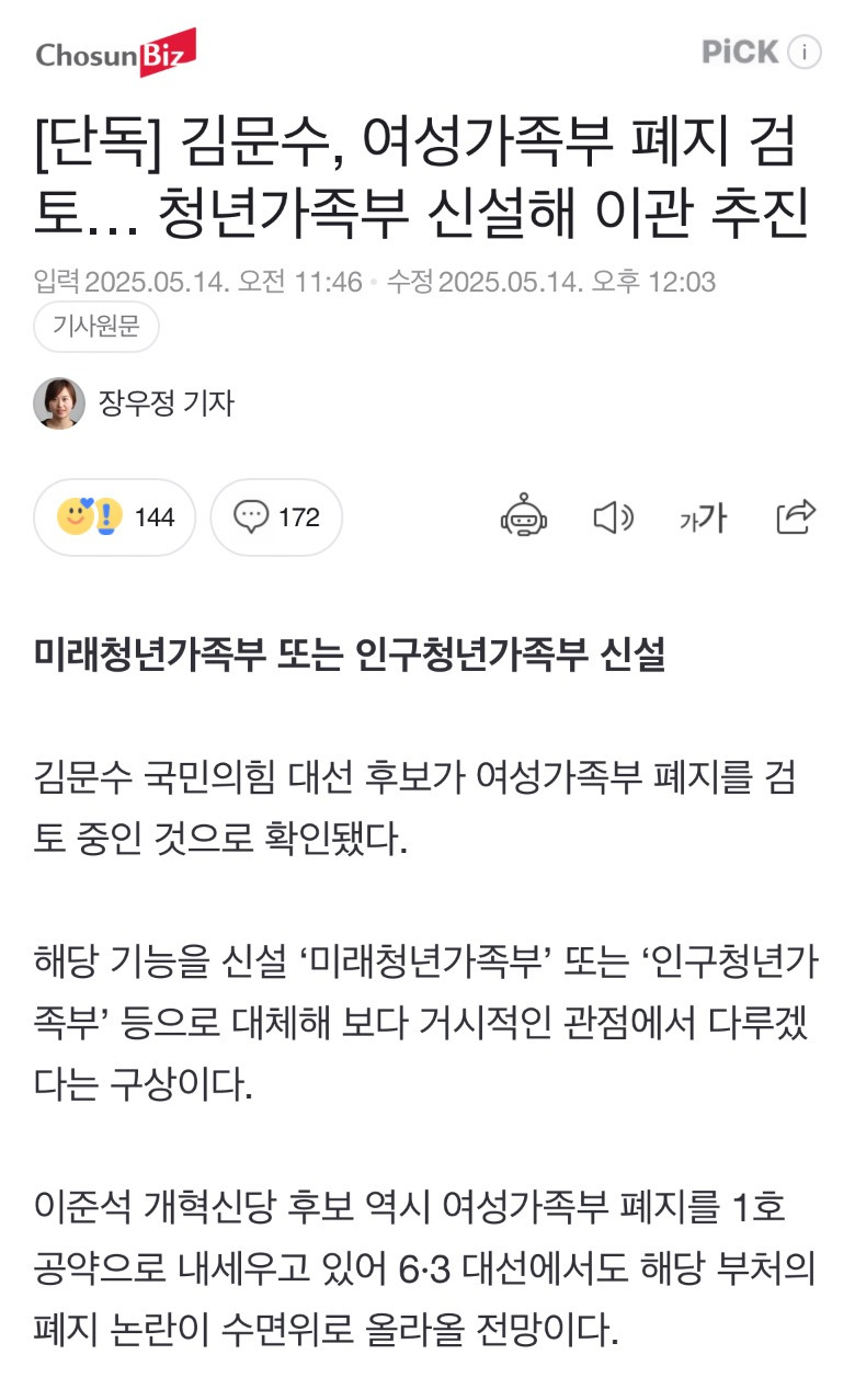 [기사][단독] 김문수, 여성가족부 폐지 검토… 청년가족부 신설해 이관 추진 작성자when|작성시간25.05.14|조회수2,258 목록 댓글 40 글자크기 작게가 글자크기 크게가 https://n.news.naver.com/article/366/0001076960?sid=154 다음검색 현재 게시글 추가 기능 열기 북마크 공유하기 신고 센터로 신고 댓글 댓글 40 댓글쓰기 답글쓰기 댓글 리스트 작성자노어이 | 작성시간 25.05.14 이게 이름 바꾸는거랑 뭐가 다르냐 작성자奇誠庸 | 작성시간 25.05.14 윤석열한테 한번 속았는데 또 속여도 또 넘어가?? 작성자고두심 | 작성시간 25.05.14 또 속냐? ㅋㅋㅋㅋ 작성자COMOLI | 작성시간 25.05.14 저들 능지면 또 속지 ㅋㅋㅋㅋㅋㅋ 작성자게르트뮐러 | 작성시간 25.05.14 오오 그 세대 또 속을 준비!!! 댓글 전체보기