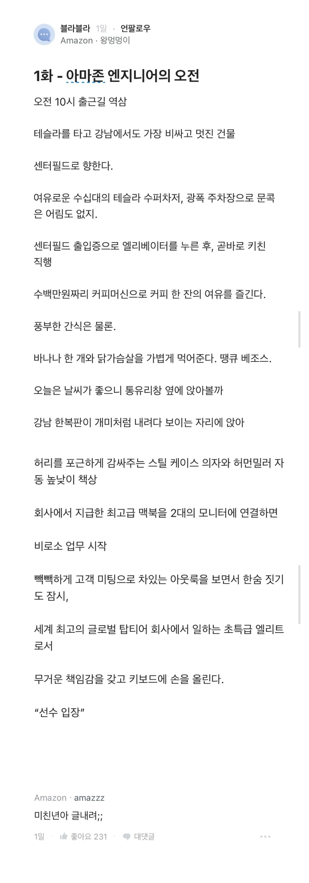 아마존 엔지니어의 오전 일상 작성자인조인간 17호|작성시간25.05.21|조회수1,528 목록 댓글 9 글자크기 작게가 글자크기 크게가 다음검색 현재 게시글 추가 기능 열기 북마크 공유하기 신고 센터로 신고 댓글 댓글 9 댓글쓰기 답글쓰기 댓글 리스트 작성자정은경 | 작성시간 25.05.21 센터필드에 아마존이 있었다니 ㄷㄷ 작성자이나경 | 작성시간 25.05.21 ㅋㅋㅋㅋㅋㅋㅋㅋㅋ 작성자디에고 고딘 | 작성시간 25.05.21 땡큐 베조스 작성자Overture! | 작성시간 25.05.21 요즘 aws 서울 오피스 많이 커지긴 했는데 저 정도는…. ㅋㅋㅌㅋ 작성자박지성포레버 | 작성시간 25.05.21 ㅋㅋㅋㅋㅋㅋㅋㅋㅋ웃기긴하네 댓글 전체보기