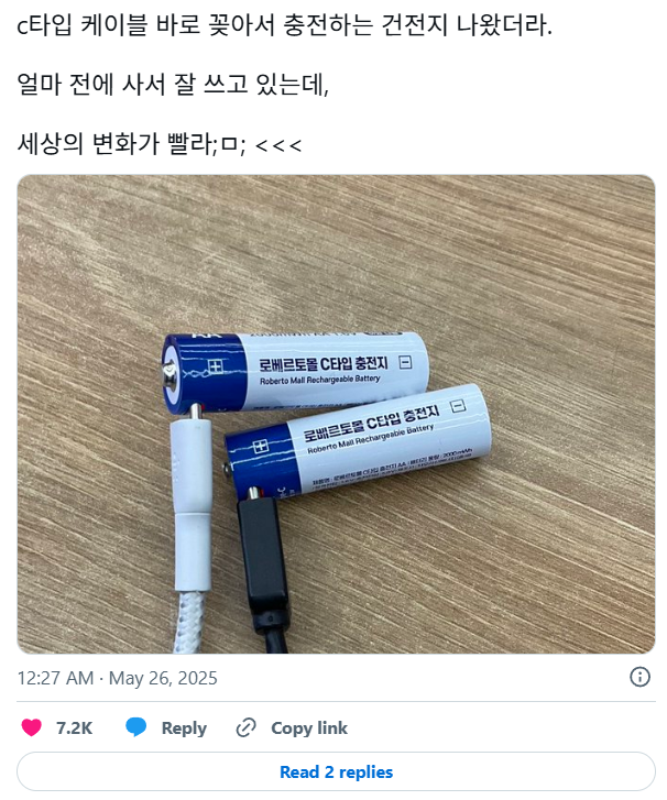작성시간 25.05.27 c타입은 첨보는데 집에 마이크로usb 꽂는 aa충전지는 있음