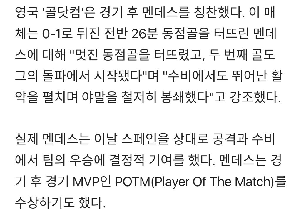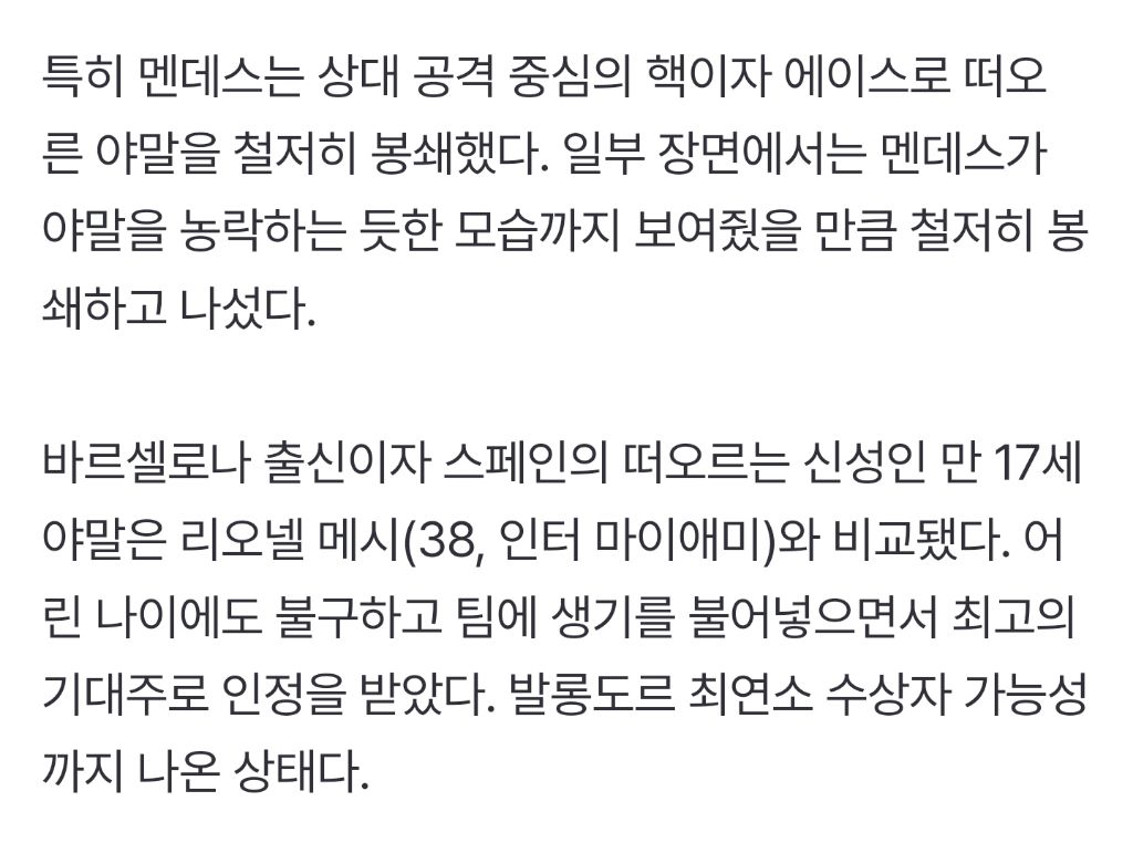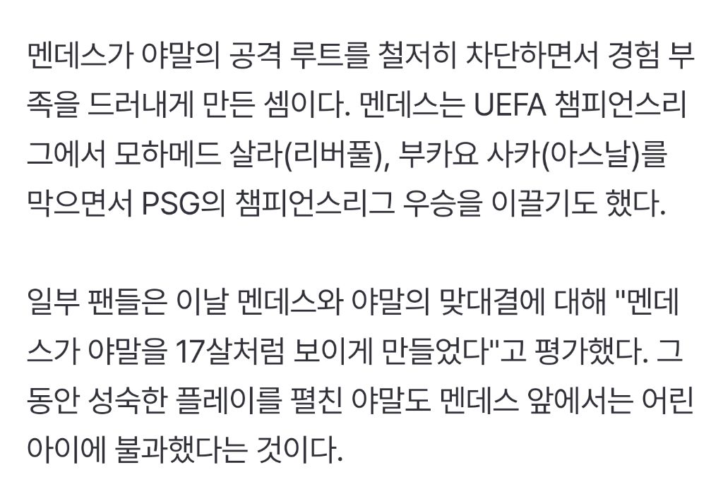 樂soccer [축구기사]"야말을 17살처럼 보이게 만들었다".. 누누 멘데스, 상대 에이스 105분간 압살 수비 작성시간25.06.09|조회수5,091 목록 댓글 5 글자크기 작게가 글자크기 크게가 https://v.daum.net/v/20250609115008605"야말을 17살처럼 보이게 만들었다".. 누누 멘데스, 상대 에이스 105분간 압살 수비[OSEN=강필주 기자] '스페인 혜성' 라민 야말(18, 바르셀로나)을 완벽하게 봉쇄한 파리 생제르맹(PSG) 수비수 누누 멘데스(23)에 대한 칭찬이 쏟아지고 있다. 멘데스는 9일(한국시간) 독일 뮌헨의 알v.daum.net 다음검색 현재 게시글 추가 기능 열기 북마크 공유하기 신고 센터로 신고 댓글 5 댓글 리스트 작성시간 25.06.09 파리가 괜히 우승한게 아님 작성시간 25.06.09 운동능력이 미쳤음 작성시간 25.06.09 잘하더라 작성시간 25.06.09 다음 시즌에 더 잘해서 복수하자근데 좀 쉬긴해야 할텐데... 작성시간 25.06.09 오지게 잘하긴 했음ㄷㄷ 카페 방문해 더 많은 댓글 만나기!