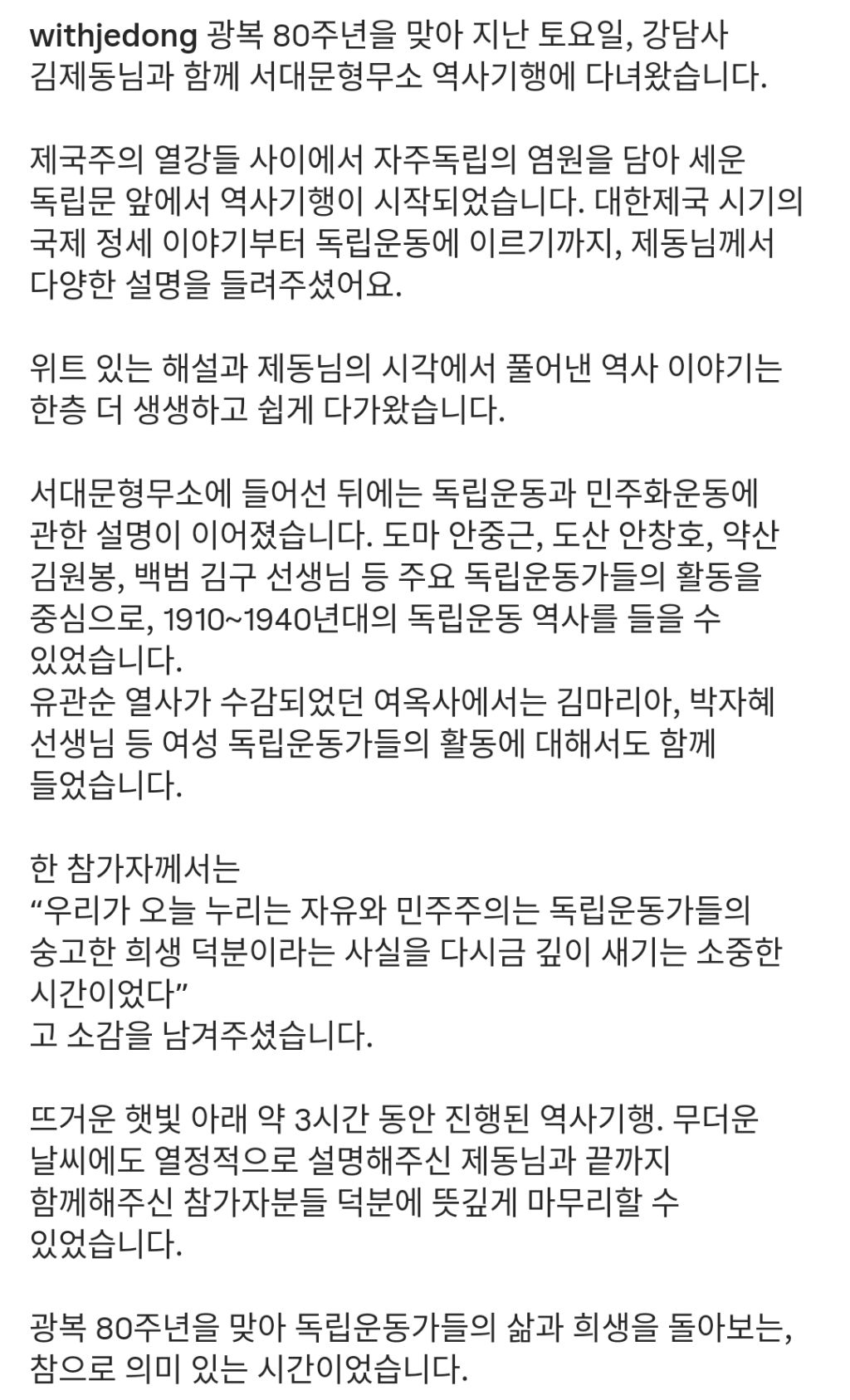 樂soccer 김제동 근황 작성시간25.06.15|조회수18,591 목록 댓글 4 글자크기 작게가 글자크기 크게가 https://www.instagram.com/p/DK6M5OzRMKs 다음검색 현재 게시글 추가 기능 열기 북마크 공유하기 신고 센터로 신고 댓글 4 댓글 리스트 작성시간 25.06.15 강사료 금액문제로 워낙 공격받아서 지금은 역사기행쪽만 하신다고 들었음 거의 봉사개념으로 다니신다고 정토회 역사기행이나 행사에 자주 참여하심 작성시간 25.06.15 이렇게 멋진 형을 유재석은...배추 강매, 목욕 가니.... 작성시간 25.06.16 👍 작성시간 25.06.16 카페 방문해 더 많은 댓글 만나기!