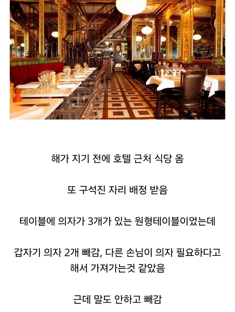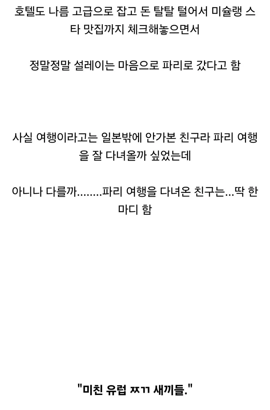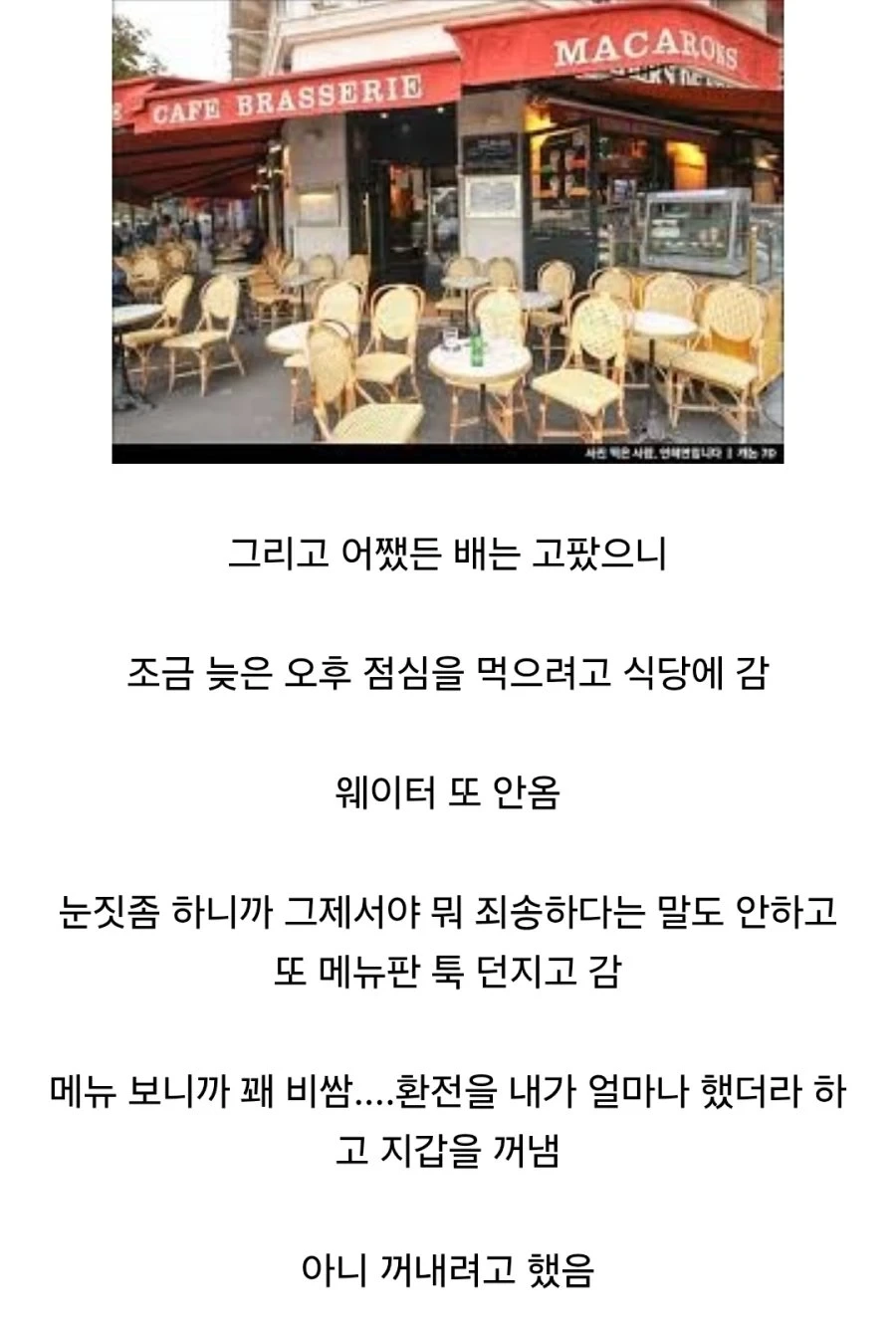 거기도 다 사람사는 곳이라 와이프랑 신혼여행으로 파리 베르샤유궁전에서 지하철 타는데 나는 내리고 와이프는 내리는 중에 문이 닫히는데 건장한 남성 3명이 문짝을 힘으로 밀어서 와이프 내리게 도와줌 ㅋㅋㅋㅋㅋ -