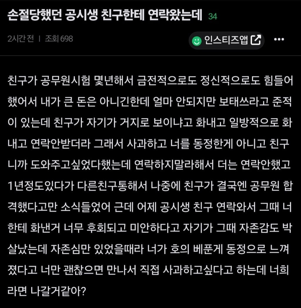 작성자세상이무너진다 작성시간 25.06.24 충분히 그럴수 있고 다시 연락온 것이면 굉장히 좋은 친구라고 봅니다