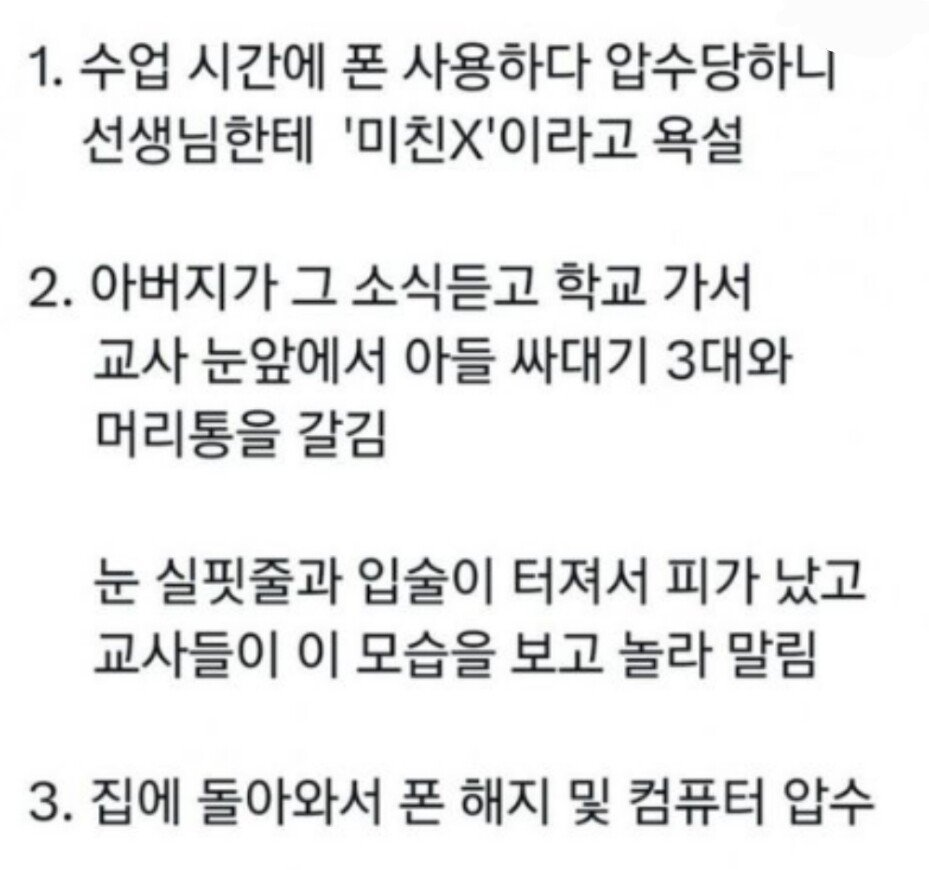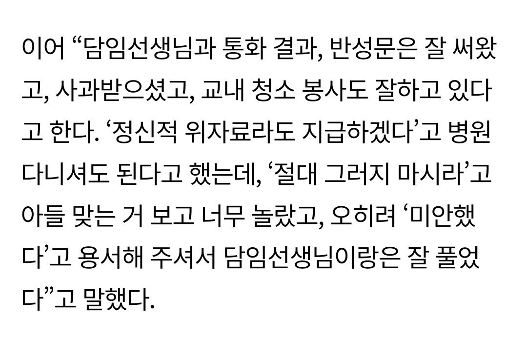 [기타]선생님에게 미친년이라고한 아들 참교육한 아빠.jpg 작성자Panzerkampfwagen|작성시간25.07.15|조회수4,385 목록 댓글 39 글자크기 작게가 글자크기 크게가 출처: https://theqoo.net/hot/3827362541 다음검색 현재 게시글 추가 기능 열기 북마크 공유하기 신고 센터로 신고 댓글 댓글 39 댓글쓰기 답글쓰기 댓글 리스트 작성자푸른 파도 | 작성시간 25.07.15 태종이 저랬으면 양녕이 임금 되었을 텐데 끔찍 작성자23번데이비드베컴 | 작성시간 25.07.15 그간 행실이 그 동안 많이 참고 계셨던듯 작성자트렌트 알렉산더 아놀드66 | 작성시간 25.07.15 참고 계셨나봄.. 작성자Marco Reus | 작성시간 25.07.15 잘팸 근데 저러고 끝나면 안됨 잘 타이르시길 작성자피러 | 작성시간 25.07.15 매가 약임 댓글 전체보기