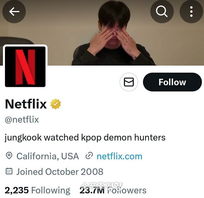 BTS 정국을 트위터 해더에 박제해버린 넷플릭스.jpg 작성자김지우|작성시간25.07.15|조회수12,210 목록 댓글 1 글자크기 작게가 글자크기 크게가 다음검색 현재 게시글 추가 기능 열기 북마크 공유하기 신고 센터로 신고 댓글 댓글 1 댓글쓰기 답글쓰기 댓글 리스트 작성자카리나 네뷸라 | 작성시간 25.07.15 어 정국 데몬이었네 댓글 전체보기