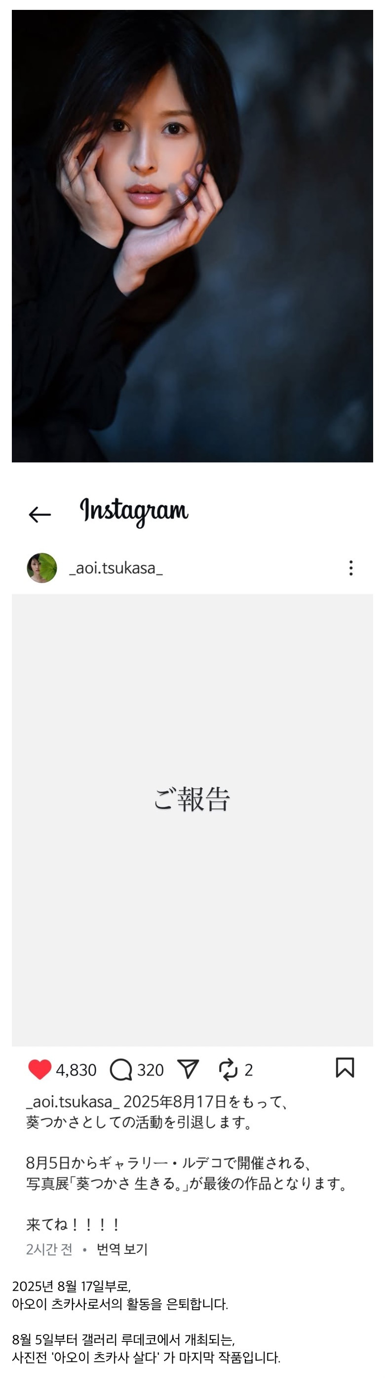 아오이 츠카사 은퇴 발표 작성자치즈팝|작성시간25.07.20|조회수3,552 목록 댓글 8 글자크기 작게가 글자크기 크게가 다음검색 현재 게시글 추가 기능 열기 북마크 공유하기 신고 센터로 신고 댓글 댓글 8 댓글쓰기 답글쓰기 댓글 리스트 작성자JEALOUSYVALLHALLA | 작성시간 25.07.20 ㅜㅜ 작성자류다희 | 작성시간 25.07.20 이미 은퇴했던거 아님? 작성자박상미 | 작성시간 25.07.20 헉 작성자크르르르 | 작성시간 25.07.20 음 ㅜㅜ 작성자헤헤ㅉㅌ | 작성시간 25.07.20 ???뭐하는분인데은퇴을?????이렇게인재가또가는구나 댓글 전체보기