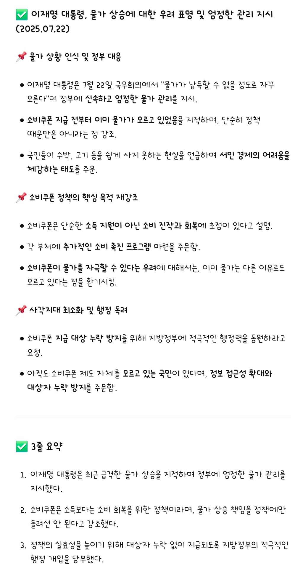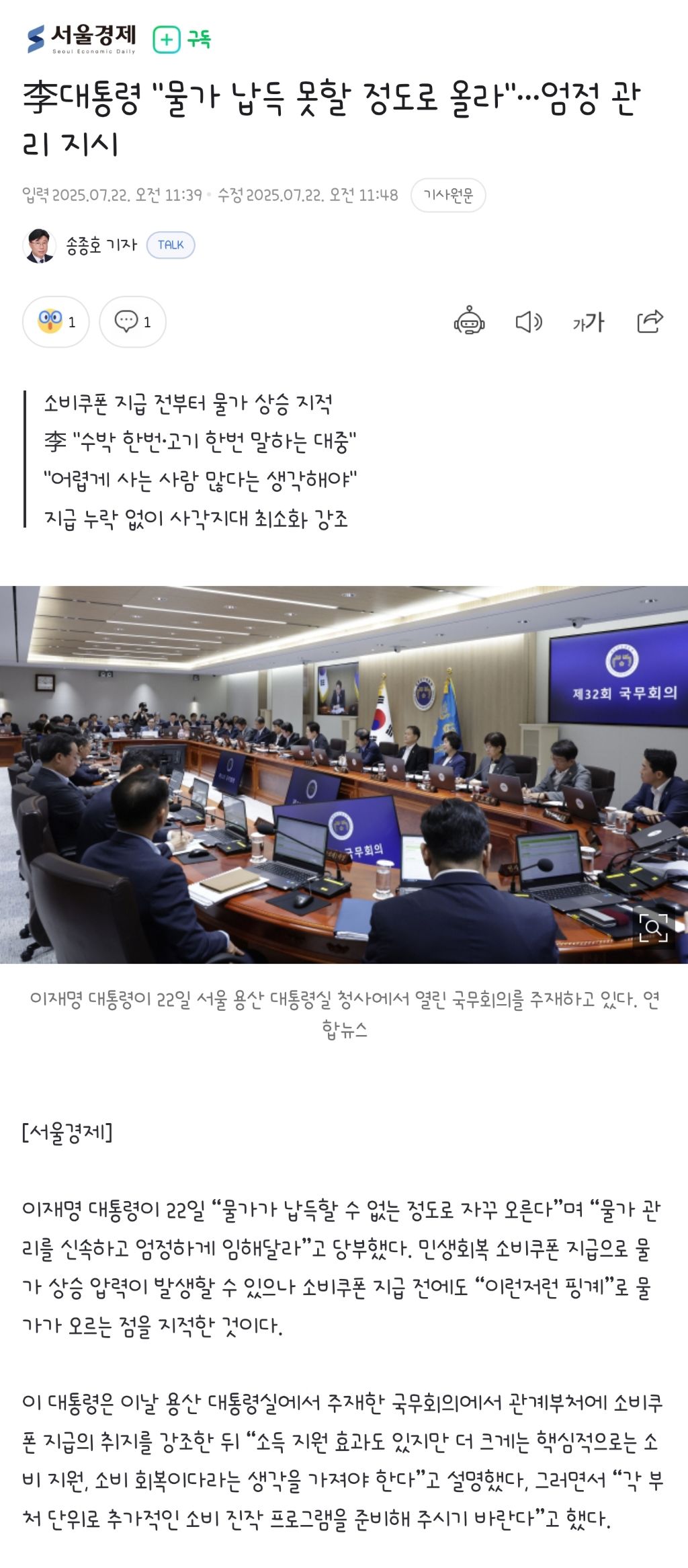 [기사]李대통령 "물가 납득 못할 정도로 올라"…엄정 관리 지시 작성자STARBUCKS|작성시간25.07.22|조회수573 목록 댓글 0 글자크기 작게가 글자크기 크게가 출처: https://n.news.naver.com/mnews/article/011/0004512051(중략)(기사 전문은 출처로)-chatgpt 요약- 다음검색 현재 게시글 추가 기능 열기 북마크 공유하기 신고 센터로 신고 댓글 댓글 0 댓글쓰기 답글쓰기 댓글 리스트