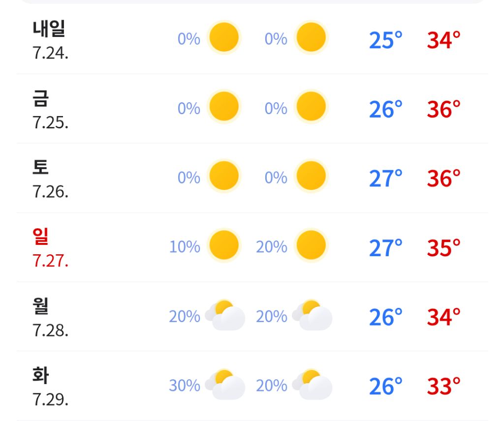미쳐버린 주말 수도권 날씨 작성자라일라일|작성시간25.07.23|조회수7,433 목록 댓글 7 글자크기 작게가 글자크기 크게가 36도ㅋㅋㅋㅋㅋㅋㅋㅋ 다음검색 현재 게시글 추가 기능 열기 북마크 공유하기 신고 센터로 신고 댓글 댓글 7 댓글쓰기 답글쓰기 댓글 리스트 작성자롭슨 | 작성시간 25.07.23 이제 진짜임 작성자데북곤 | 작성시간 25.07.23 주말 캠핑인데 오우 걱정이네 작성자전문키커 이세은★ | 작성시간 25.07.23 제목 그대로네 작성자오이는빼고주세요 | 작성시간 25.07.23 여름 이녀석 돌아왔구나 작성자축구학개론 | 작성시간 25.07.23 살려줘 댓글 전체보기